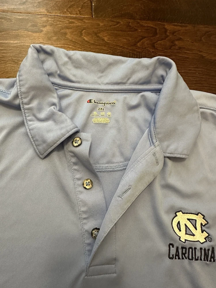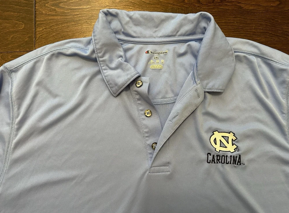 Neckline: Collared Size: 2XL Department: Men Pattern: Solid Type: Polo Size Type: Regular Material: Polyester, 100% Polyester Character: UNC, Tar Heels, North Carolina, Carolina Color: Blue Brand: Champion Sleeve Length: Short Sleeve