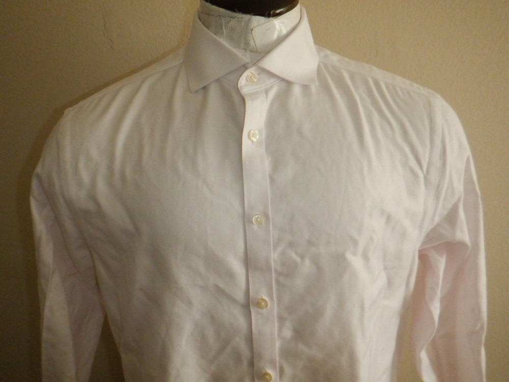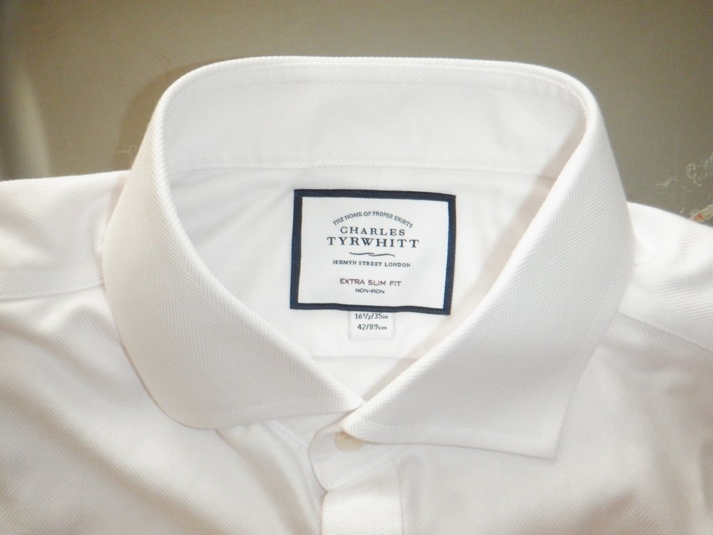 The Charles Tyrwhitt NON-IRON Extra Slim Fit 16.5-35 Light Pink Dress Shirt is a stylish and sophisticated choice for the modern gentleman. Made from 100% cotton, this shirt features a solid pink color and a collared neckline with a button closure. The extra-slim fit and long sleeves make it perfect for formal occasions, while the non-iron feature ensures easy care and maintenance. The spread collar and French cuff accents add a touch of elegance to this timeless piece, making it a versatile option for any season. This shirt is in excellent used condition with the exception of a rip in the French cuff that won't be seen when cuffed. Thanks and good luck. Measurements: Armpit to armpit: 23 inches. Length: 32 inches.