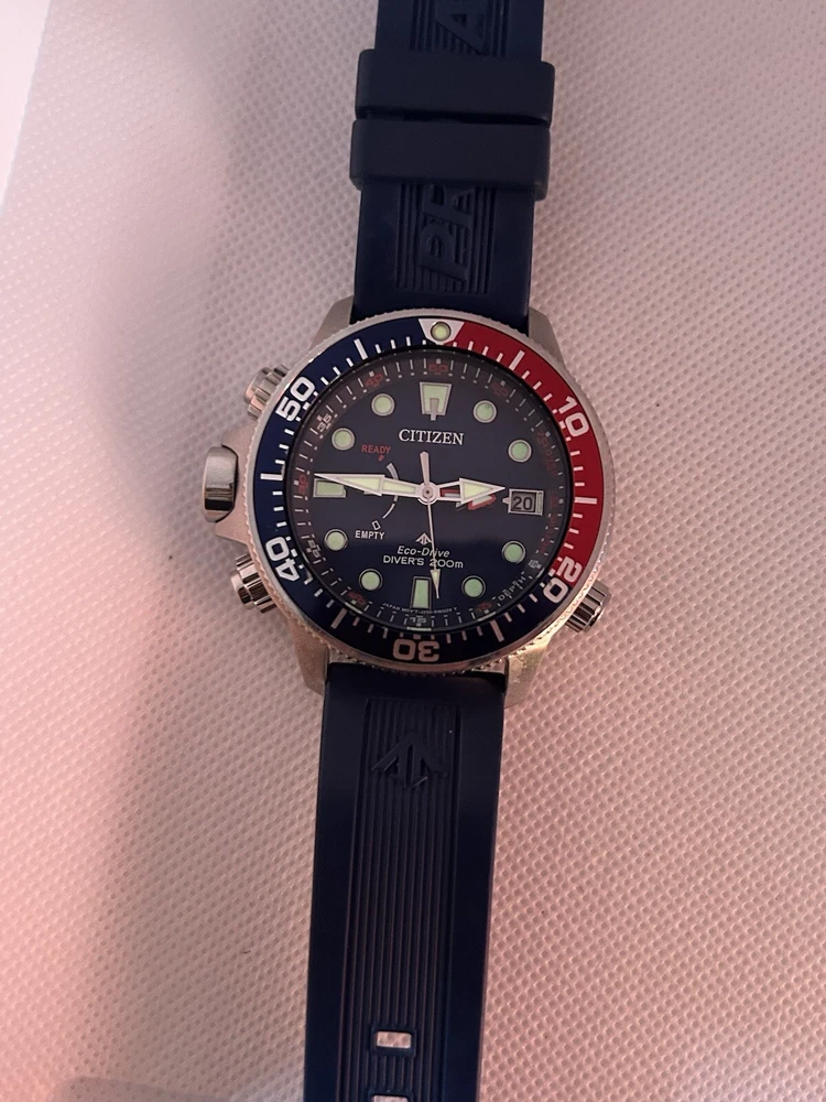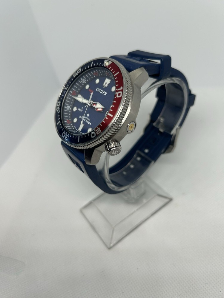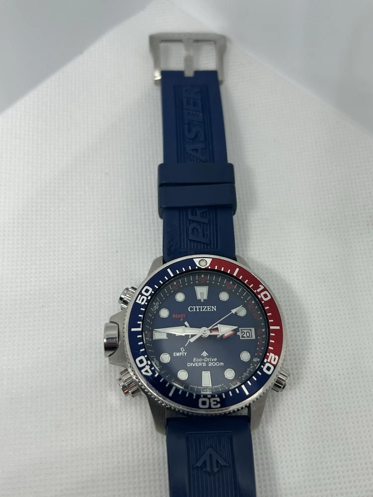 Elevate your style with this sophisticated men's wristwatch from Citizen. With a sleek silver case and a durable stainless steel caseback, this Eco-Drive watch is not only stylish but also designed to last. The blue two-piece strap made of rubber provides a comfortable fit while the watch is water-resistant up to 200 meters, making it perfect for diving and water sports. The analog display is powered by a reliable quartz movement and features a 12-HR. dial, multi-dial, and non-numeric hour marks. The watch also includes a date indicator, depth indicator, and mineral crystal for added functionality. The Citizen Eco-Drive BN203801L is a perfect accessory for any occasion, whether you're going to work or out for a dive. This Watch is pre-owned and has minor signs of use to it such as minor scratches on its crystal and caseback and some dirtyness on its strap. Watch is fully functional and works as it should measurement of the watch is shown in pictures. Message me if you are interested