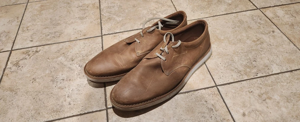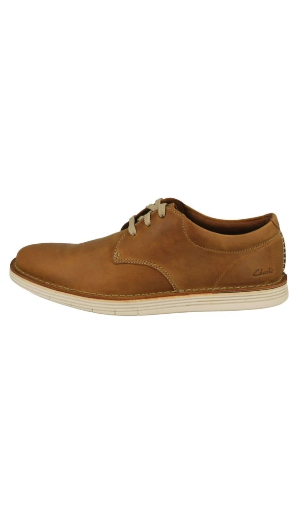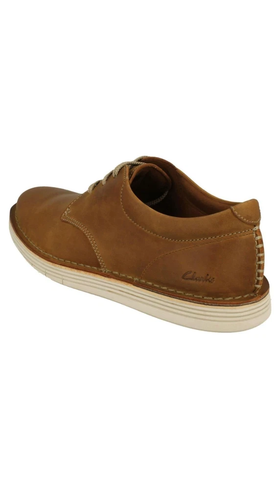 Men's Clarks Stylish Lace Up Shoes in Tan (Brown) with a leather upper and lining, featuring a synthetic sole. The shoes are UK size 14, US size 15, and EU size 49.5. The model is Forge Vibe, suitable for casual wear.