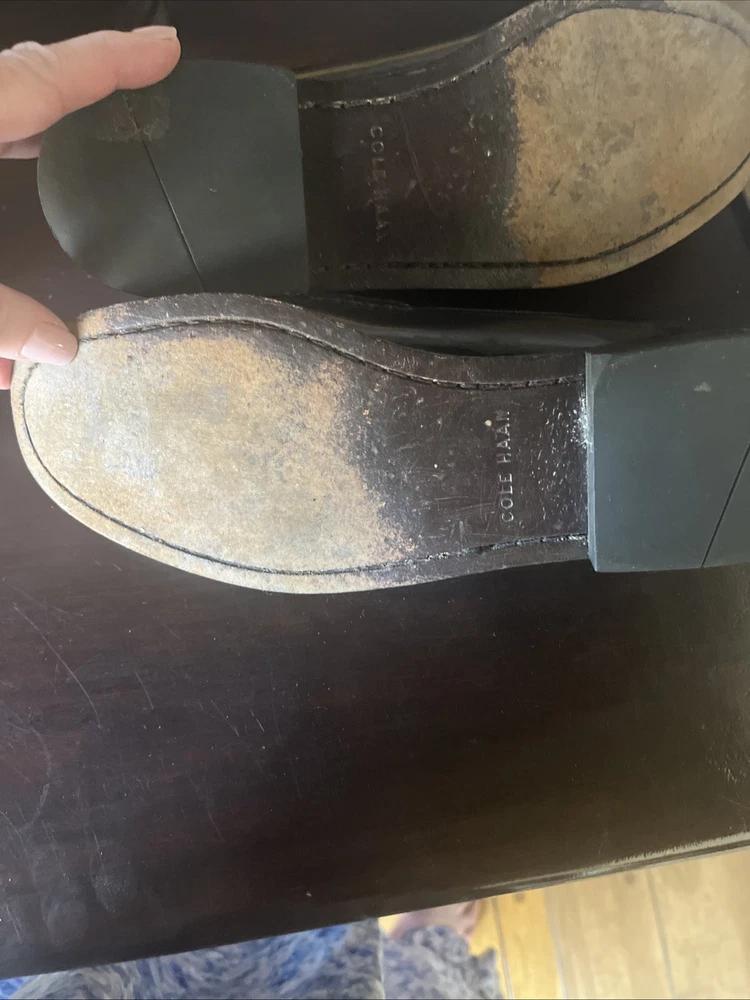 The product is a pair of Men’s Cole Haan Classic Black Penny Loafers in size 8D. These dress shoes are crafted from black leather with a D width and leather insole. The outsole is also leather, making them durable and stylish for any formal occasion. These loafers are part of the Cole Haan Pinch product line, combining classic design with modern comfort and quality. Ideal for those looking for a sophisticated and timeless addition to their wardrobe. These insoles were removed to accommodate orthotics. Otherwise they are in mint condition. If you utilize orthotics, these will be the perfect pair for you. Priced to sell!