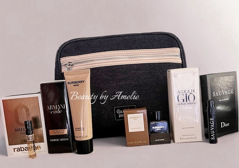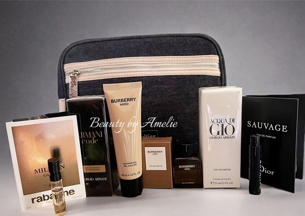 Armani Code EDP spray Burberry Hero EDP splash Armani Code Acqua Di Gio Eau de Parfum Spray Burberry Hero Shower Gel/ Hair & Shower Gel 1.0 oz Dior Sauvage sample 1.0 ml Paco Rabanne 1 million sample 1.5 ml Jean Paul Gaultier toiletry bag ALL TRAVEL SIZES