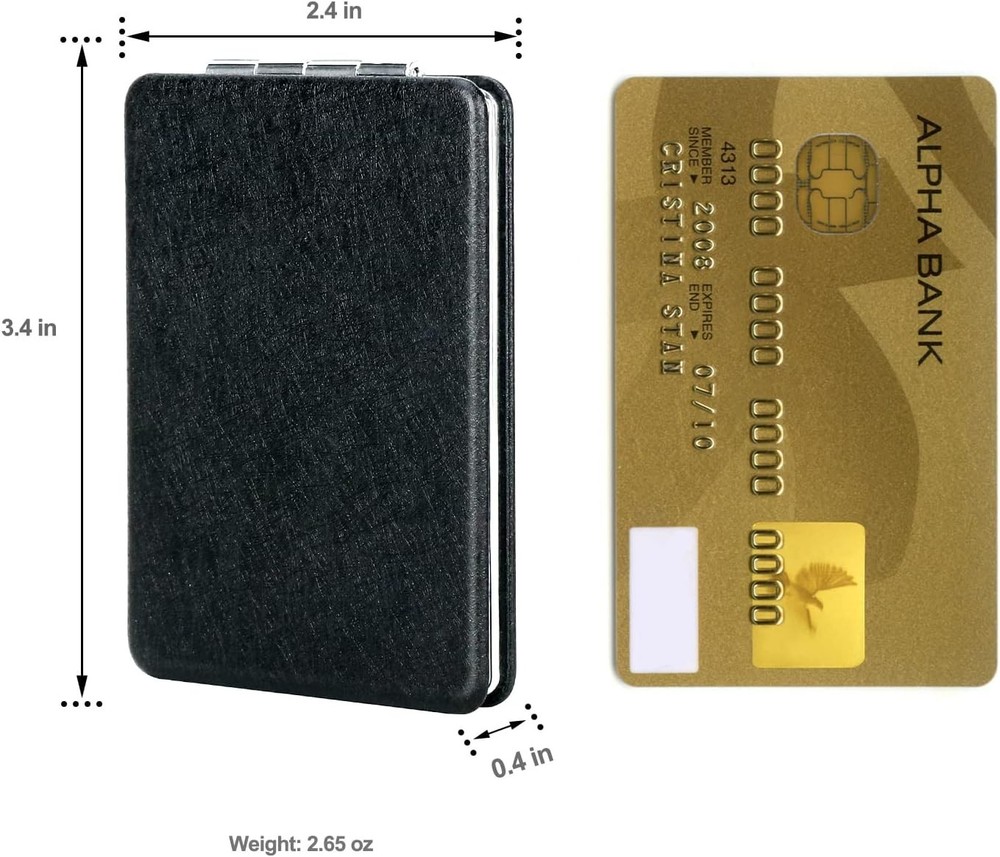 Compact Vanity Mirror for Men, Black, Travel Makeup Mirror for Handbag Pocket Wallet, Portable Double-Sided Magnifying Cosmetic Mirror for Daily, Work, Business Product Description: Specifications: Material: Metal + Glass + PU leather Color: elegant black Dimensions: L 3.4 * W 2.4 * H 0.4 inch Weight: 2.65oz/75g Quantity: 1 unit Features: 1. Classy and Versatile, Simple and Modern 2. Compact and Lightweight, Sturdy and Reliable 3. Suitable for Daily, Work, Travel or Business Use 4. Folding and Double-Sided, one side 1X Regular and the other side 2X Magnifying 5. Reusable and Environment-Friendly Package: 1 unit x Black Pocket Mirror in a Gift Bag .