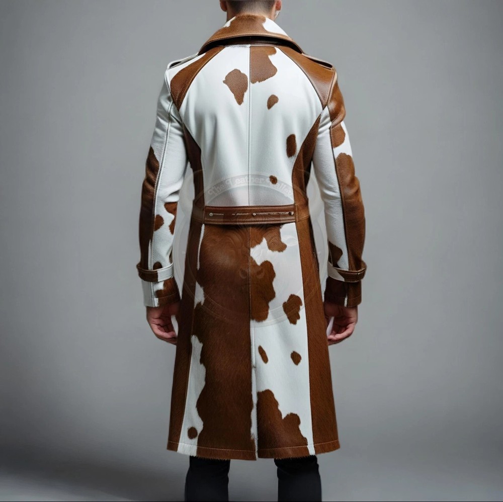This Men's Cowhide Leather Coat is a stylish and unique addition to any wardrobe. Made with natural hair on cow print pony skin, this Western jacket features a spread collar and button closure for a classic look. The multicolor animal print adds a touch of personality to the trench coat style, making it perfect for travel, parties, or casual outings. With a size range from XS to 4XL and regular fit, this coat is sure to accommodate any body type. Plus, the all-season design and bodywarmer features make it a versatile piece for winter, fall, and spring. Made in Pakistan, this coat is a quality product crafted for the modern man.