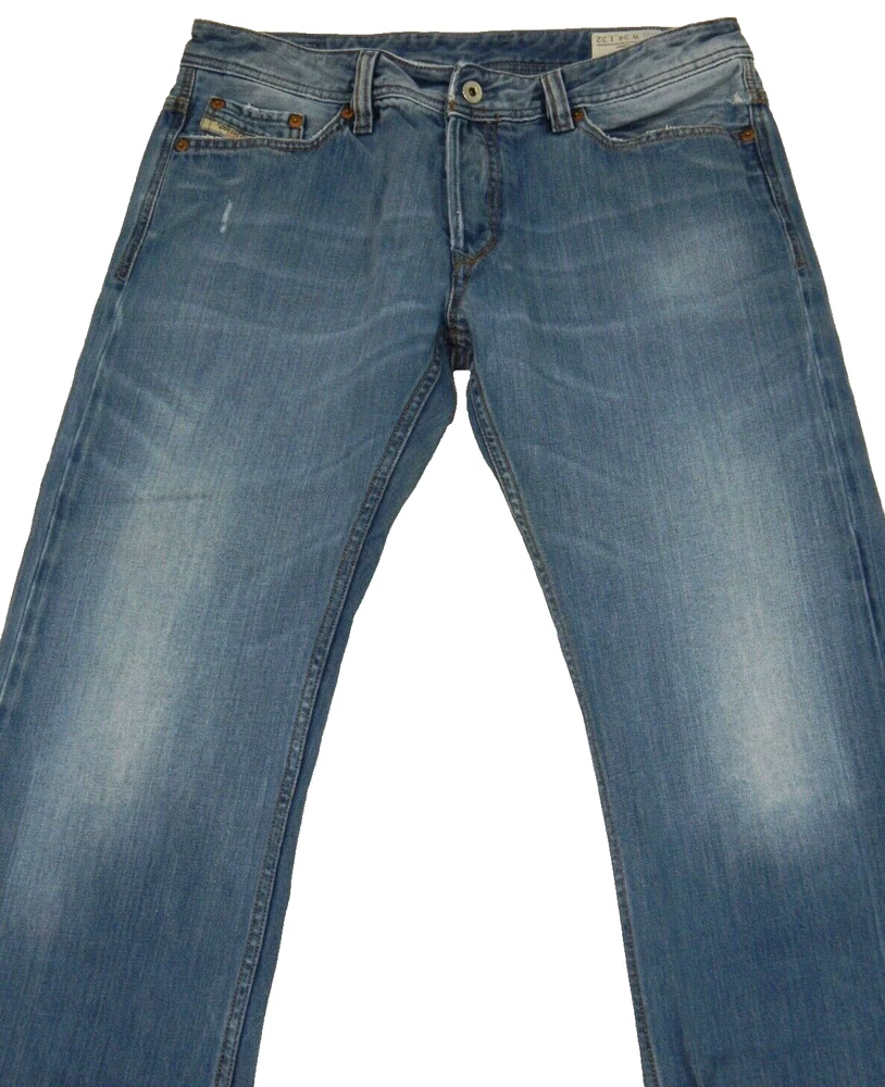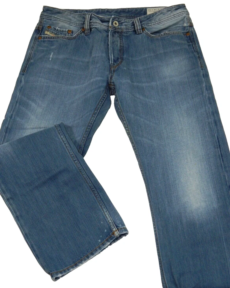 Destroyed pair of Diesel Brand Viker Slim Straight Button Fly Premium Denim Blue Jeans. Tag Size: W34 L32. Not quite this size now. Measured in inches: Waist: 16, Inseam: 31, Front Rise: 9.5, Leg Opening: 8.5. Worn below the waist. 100% Cotton. BWO3