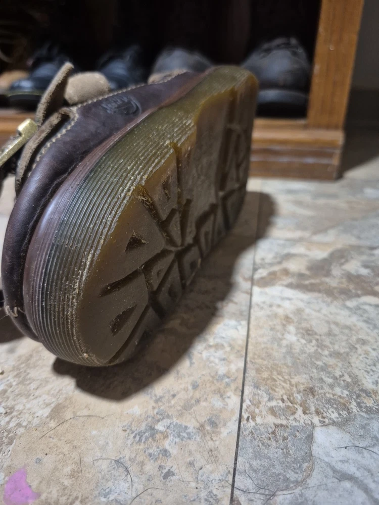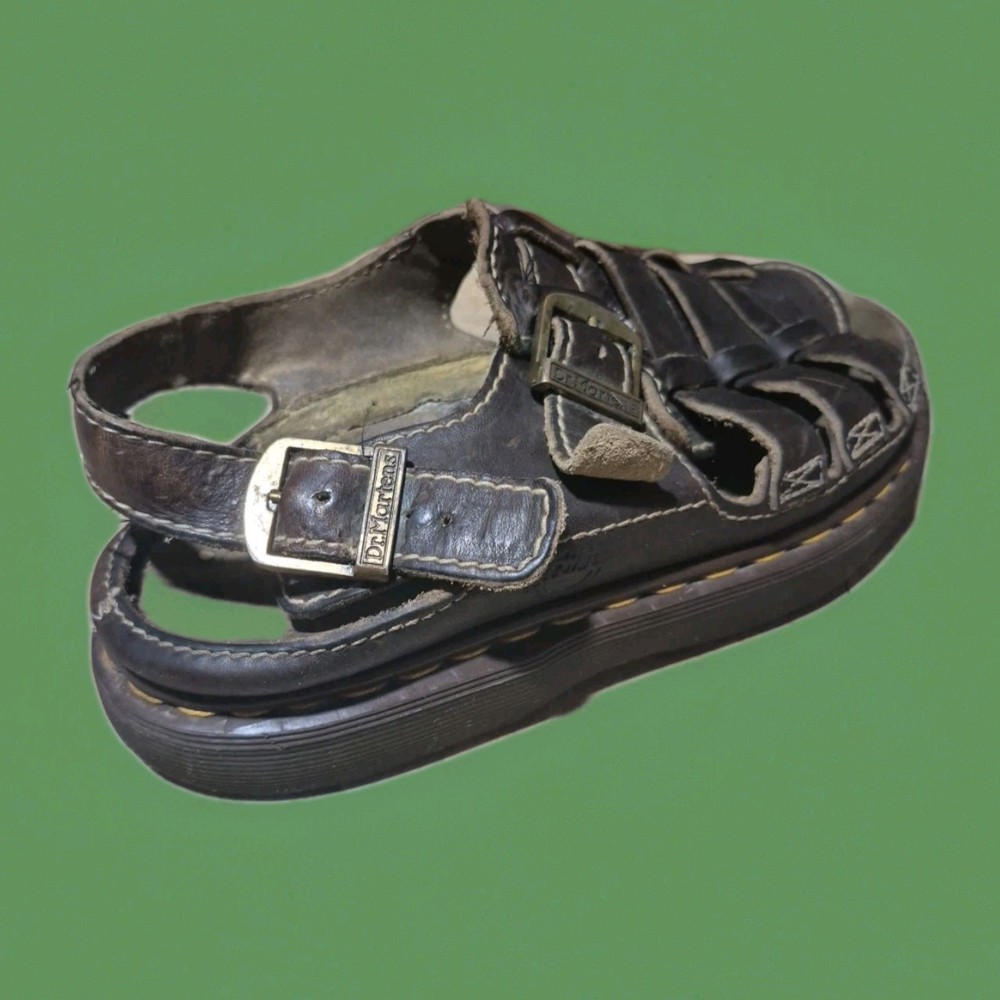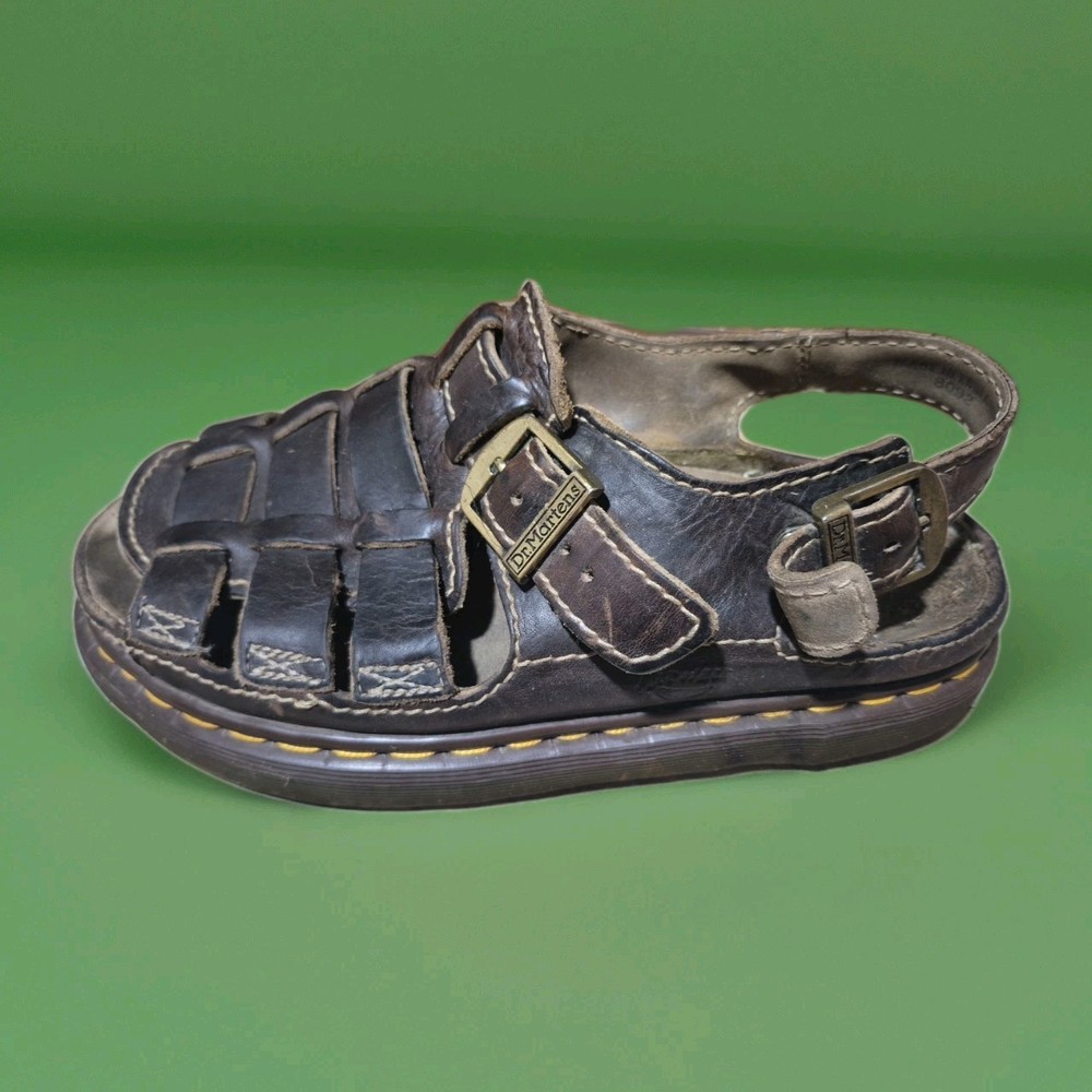 The product is a pair of Doc Dr. Martens Men's Sandals in brown leather, made in England and in size 10. These sandals feature a solid pattern, fisherman character, and a slip-on style with a adjustable buckle closure. The outsole is synthetic, and they are designed for casual occasions with a retro 90s outdoor theme. Made by the iconic brand Dr. Martens, these sandals showcase their signature logo accents and offer durability and style for the modern man.