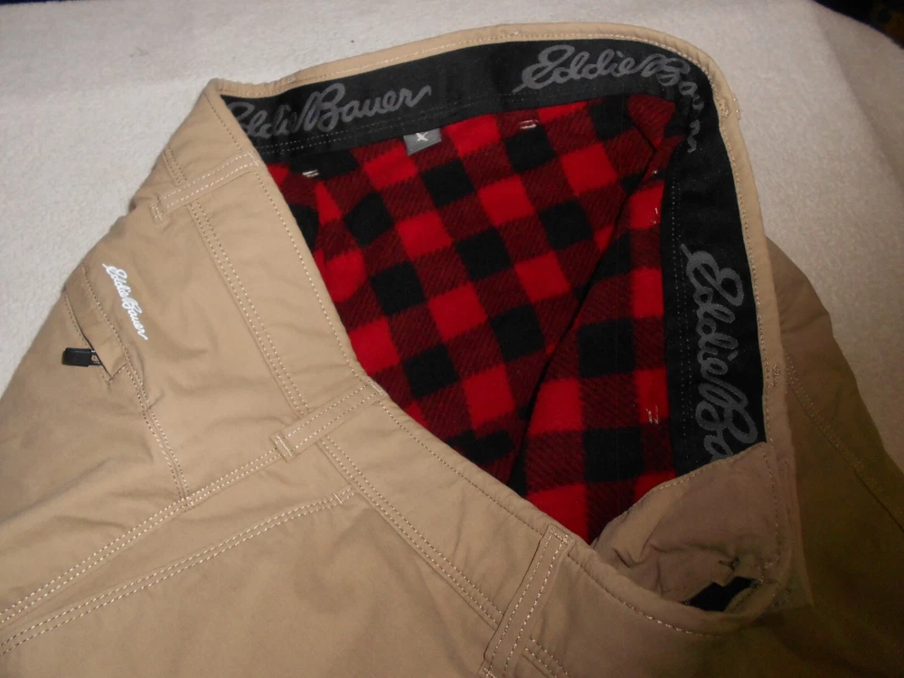 gtin13: Does not apply Size Type: Regular Material: Cotton Blend Waist Size: Marked 36 - Actual 36 Pocket Type: 5-Pocket Design Country/Region of Manufacture: Sri Lanka Style: Khakis MPN: Does Not Apply Season: Winter Front Type: Flat Front Rise: Classic Fabric Wash: Light Pattern: Solid Suspender Buttons/Belt Loops: Belt Loops Fit: Classic Garment Care: Machine Washable Features: Stretch Closure: Zipper Fly Brand: Eddie Bauer Size: L Model: Fleece Lined UPC: Does not apply Inseam: Marked 34 - Actual 34 Color: Tan Department: Men