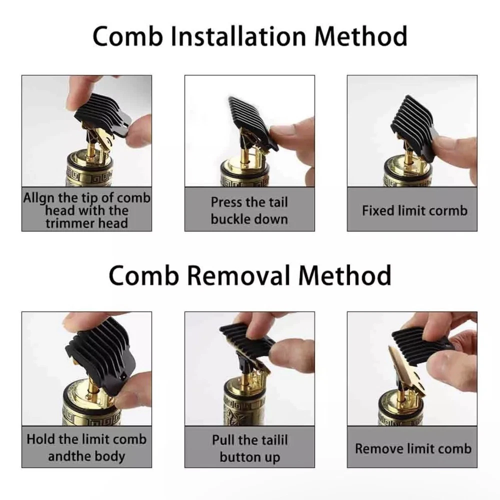 Hair Clippers and Beard Trimmer for Men – Professional Grooming Kit Achieve the perfect haircut and beard trim with this powerful, easy-to-use hair clipper and trimmer. Designed for both professional and home use, it features a high-performance motor, low vibration, and an ultra-quiet operation, making it ideal for creating various hairstyles with precision. The cordless design allows for easy maneuverability, whether you’re at home, work, or traveling. Key Features: • R-Shaped Sharp Angle Design: The trimmer’s R-shaped design prevents skin irritation while providing a sharp, wear-resistant blade for smooth cuts. • Ergonomic & Non-Slip Handle: The clipper features an exquisite, comfortable handle with carved patterns, making it easy to grip for a precise trim. The low noise operation ensures a quiet, pleasant grooming experience. • Powerful & Sharp Performance: Quickly captures and cuts hair evenly, saving time and effort. The waterproof design allows for easy cleaning under running water. • Low Noise Operation: Enjoy a quiet grooming experience without disturbing those around you, perfect for early mornings or when your baby is sleeping. • Perfect Gift: With its sleek design and quality craftsmanship, this hair clipper makes an excellent gift for any man – ideal for your boyfriend, husband, father, or friend. Specifications: • Color: Gold, Black • Power: 5W • USB Cable: 5V • Battery: 1200mAh Li-ion Battery • Operating Time: Up to 2 hours • Charge Time: 2 hours • Charging Method: USB Charging Package Includes: • 1 x Hair Clipper • 1 x USB Charging Cable • 1 x Cleaning Brush • 1 x User Manual • 1 x Gift Box • 4 x Limit Combs Perfect for personal use or as a thoughtful gift, this hair clipper and beard trimmer will keep you looking sharp with every trim.