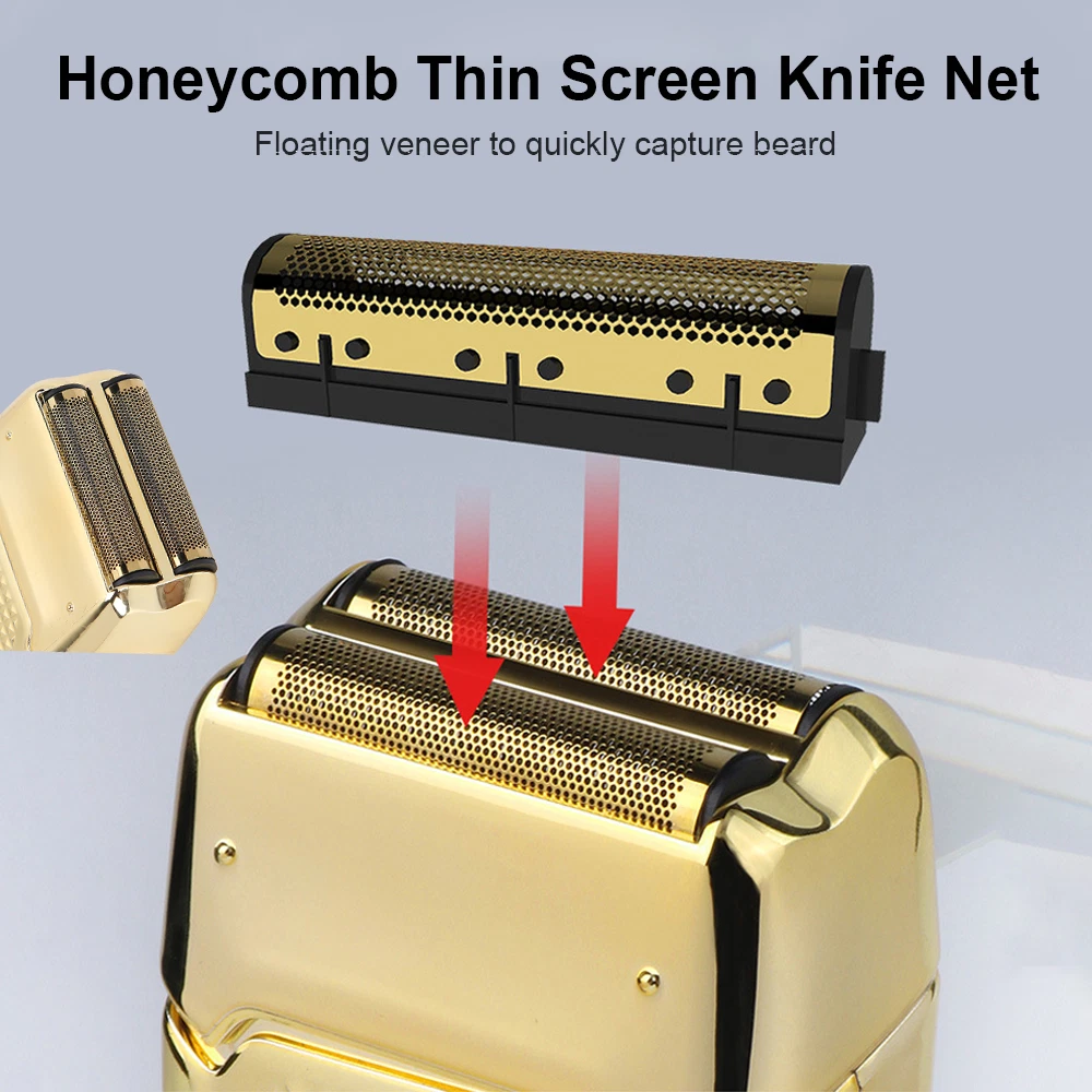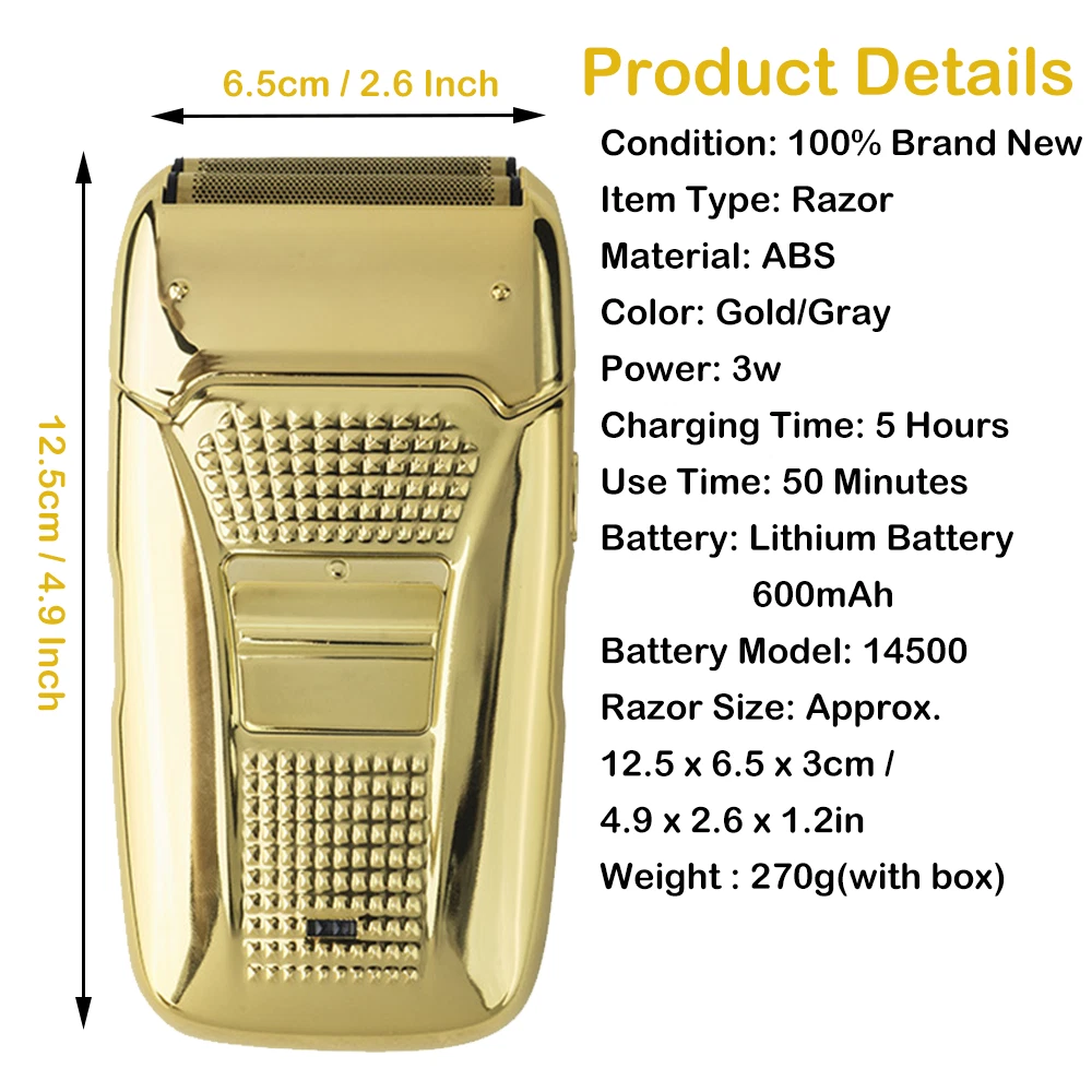 Des c ri p tion: Comfortably Fits Facial Contours: Alternate shaving design, elastic facial adjustment system, conforms comfortably to facial contours, no residue after shaving. Double Blade Design: Slim Screen Knife Net, Floating Face Adjustment to Quickly Capture Beard. Double blade design, fast cutting beards, incisive and not glued. Dual-purpose charging plug: Dual-use charging and plug, USB charging design, equipped with USB charging cable, can be connected to a variety of USB power ports, convenient charging. Multifunctional: Multifunctional, can be used to shave the bald head and shave the beard. Conforms to the ergonomic design, easy to grip and use. Easy to carry: Light and small in size, equipped with a storage bag, easy to carry when going out. Condition: 100% Brand New Item Type: Razor Material: ABS Color: Gold/Gray Power: 3w Charging Time: 5 Hours Use Time: 50 Minutes Battery: Lithium Battery 600mAh Battery Model: 14500 Razor Size: Approx. 12.5 x 6.5 x 3cm / 4.9 x 2.6 x 1.2in Weight : 270g(with box) Package List: 1 x Razor 1 x Storage Bag 1 x Transparent Cover 1 x Head Cover 2 x Half-Round Knife 1 x Cleaning Brush 1 x Manual 1 x USB Charging Cable