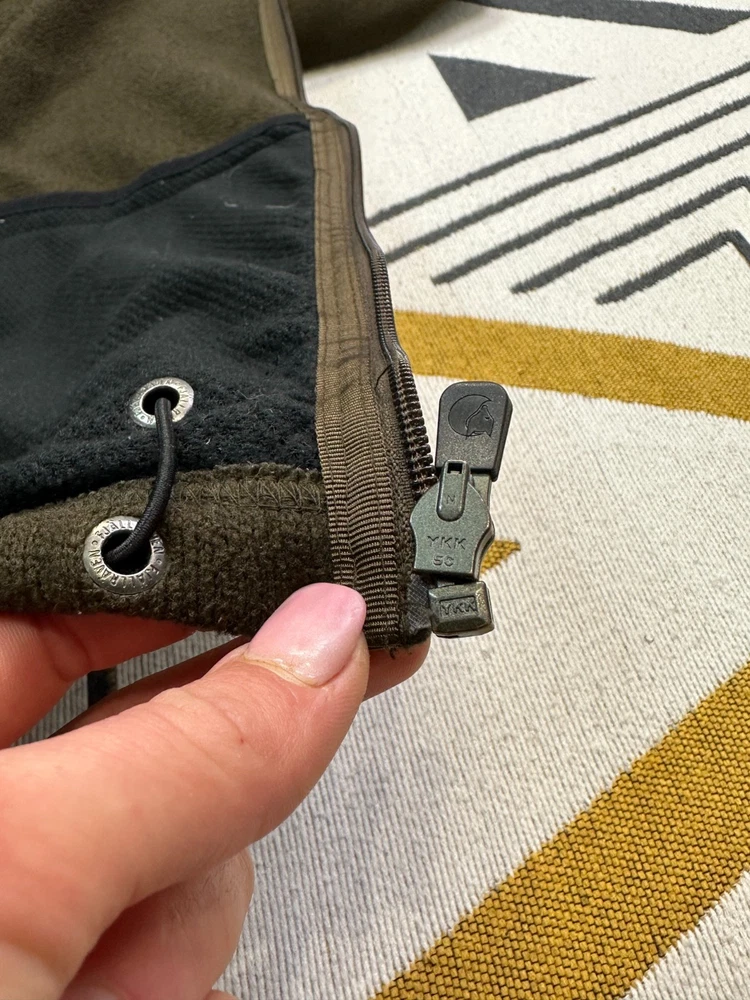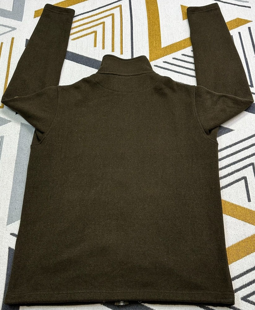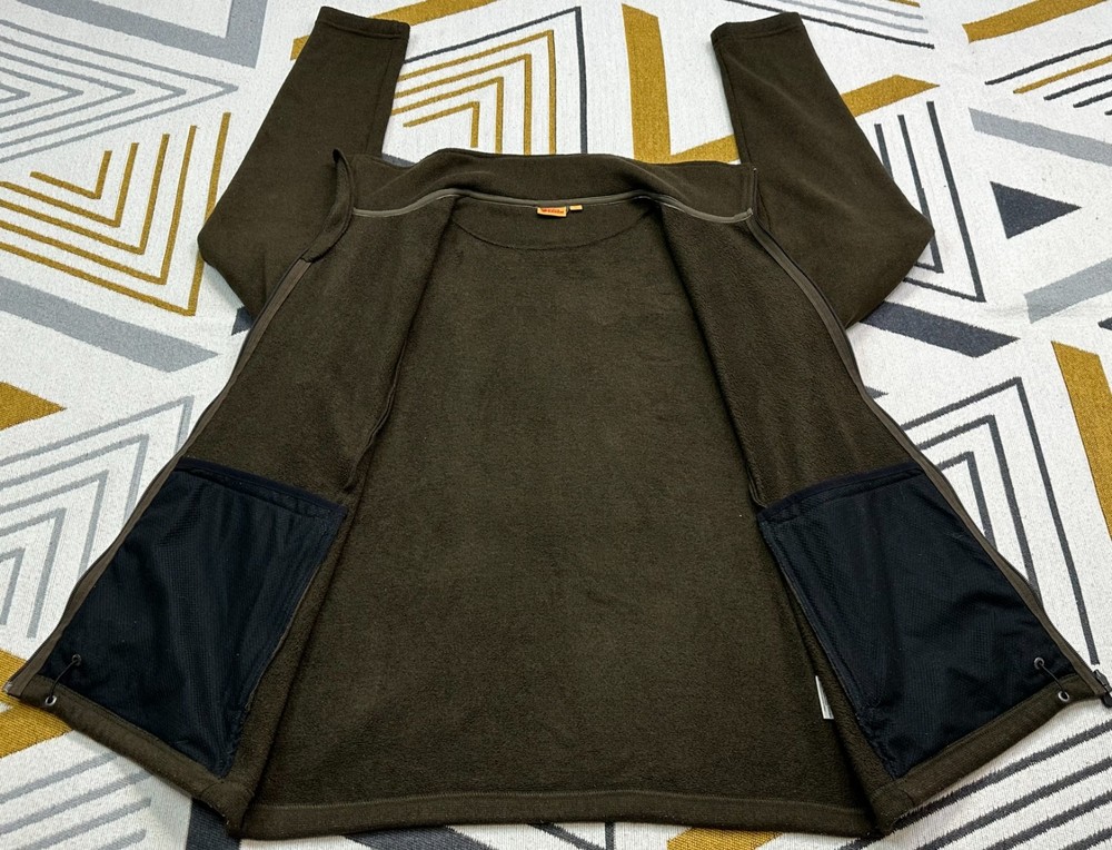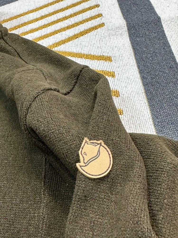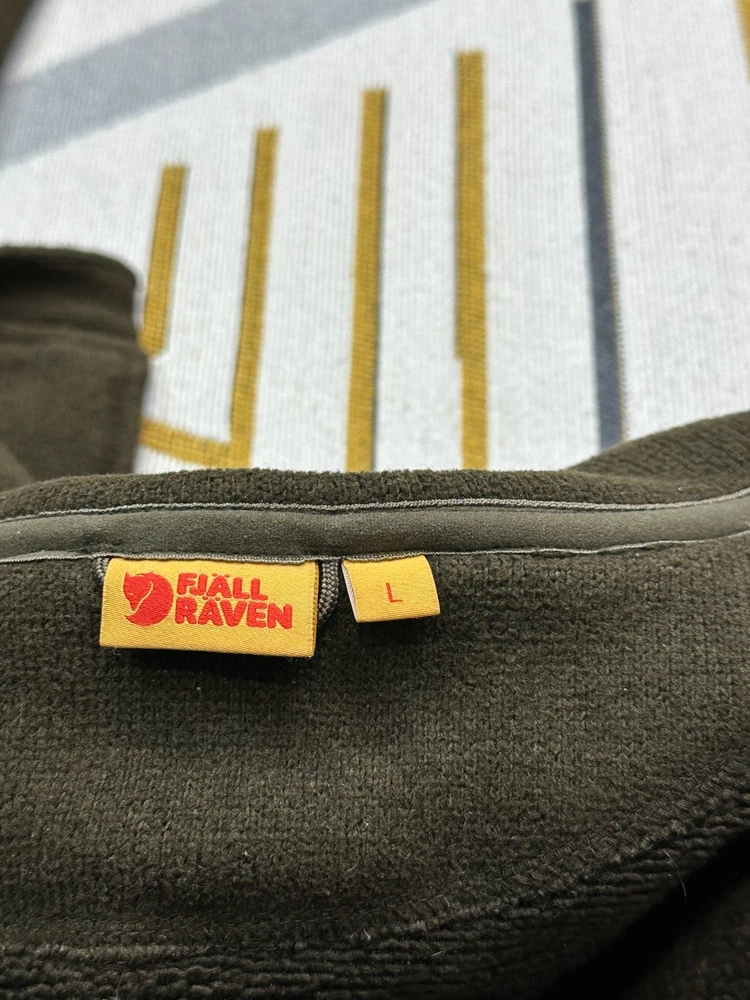 Item details Brand / Model: Fjällräven Sten Fleece M, style 82883 “Sten Fleece”, classic full‑zip knitted fleece jacket. Gender / Size: Men’s L, regular fit. Colour: Dark olive green with matching zip and subtle Swedish flag tab at the hem; leather Fjällräven fox badge on the sleeve. Fabric: Lightweight knitted fleece in recycled polyester with soft brushed inner face, designed as a warm, breathable midlayer. Features High stand collar and full‑length front zip with chin guard. Two low‑profile hand pockets, large internal mesh drop pockets and adjustable hem drawcord. Measurements (from your sheet, approx.) Shoulder to shoulder: 19.2 in. Chest (pit to pit, laid flat): 23.7 in → about 47 in around. Sleeve length from shoulder: 26 in. Back length (collar seam to hem): 27.2 in. Best for someone who usually wears men’s L–XL or chest about 41–45 in and wants a slightly relaxed fleece fit. Condition Overall: Good used condition. Some light pilling and minor lint from wear but no major holes or damage; zips and drawcords work correctly and all labels and badges are intact.