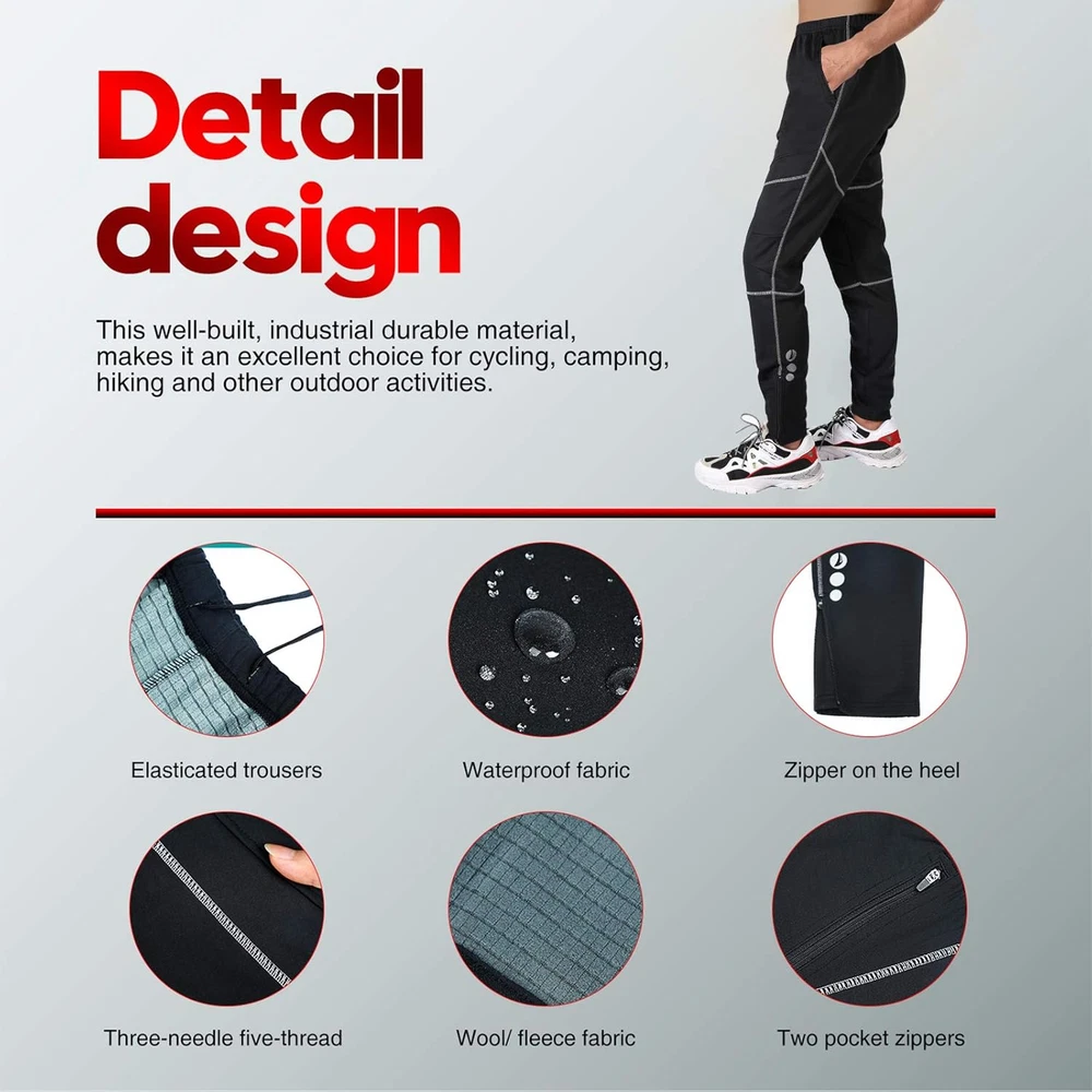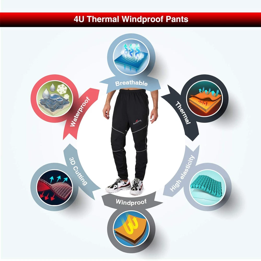 Product Description The 4ucycling sweatpants are made from high-end materials with a microfleece lining that is windproof and splash resistant to keep you warm in cold weather. The knees and pleated crotch enhance your range of motion for easy riding. Don't let the cold weather keep you off your bike!