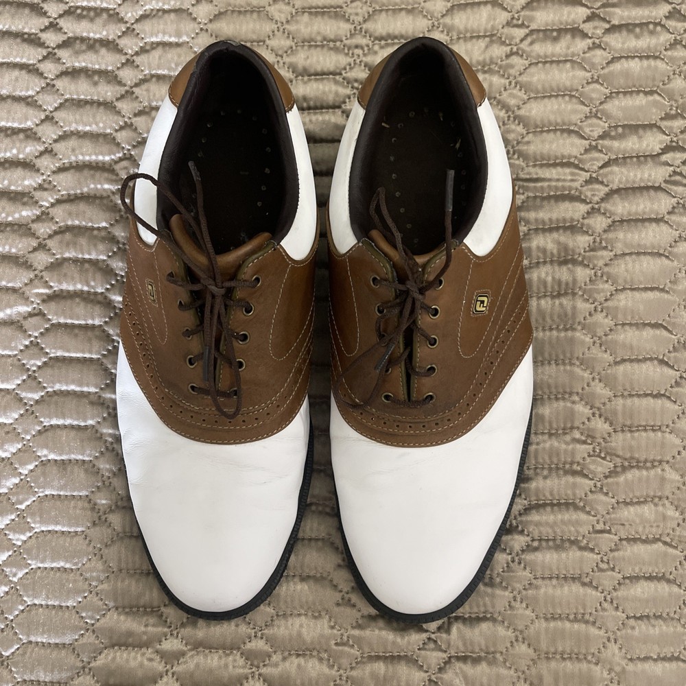 The FootJoy Men's Golf Shoes in White/Brown, size 12, are designed for activewear occasions, specifically for golfing. These athletic shoes feature a synthetic lining, leather upper material, and a rubber outsole for durability and comfort. The saddle style shoe with a dog theme is part of the FootJoy Fit Dogs product line, ensuring a high-quality fit and performance on the golf course. Made in China, these shoes are an excellent choice for any golfer looking for style and functionality in their footwear.