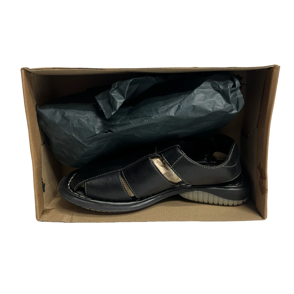 GBX Shoes Mens Size 8 Black Leather Fisherman Sandals Open Toe Comfort Casual Condition: New without box. No visible signs of wear. Extra tissue paper and packaging included. Box shows shelf wear and creasing (see photos). Premium quality black leather upper with contrast stitching Classic fisherman sandal design with cutouts for breathability Hook and loop adjustable strap closure for easy on/off and secure fit Padded synthetic insole and collar for all-day comfort Flexible, two-tone non-marking rubber outsole for traction Style/Model: 9263-1 Material details (from tag): Upper and lining leather, manmade sole Marked size: 8 D (Mens) Color: Black with beige accent on outsole and inner lining All brand markings and labels clearly shown in photos Great casual sandal sandals for summer, travel, or everyday comfort