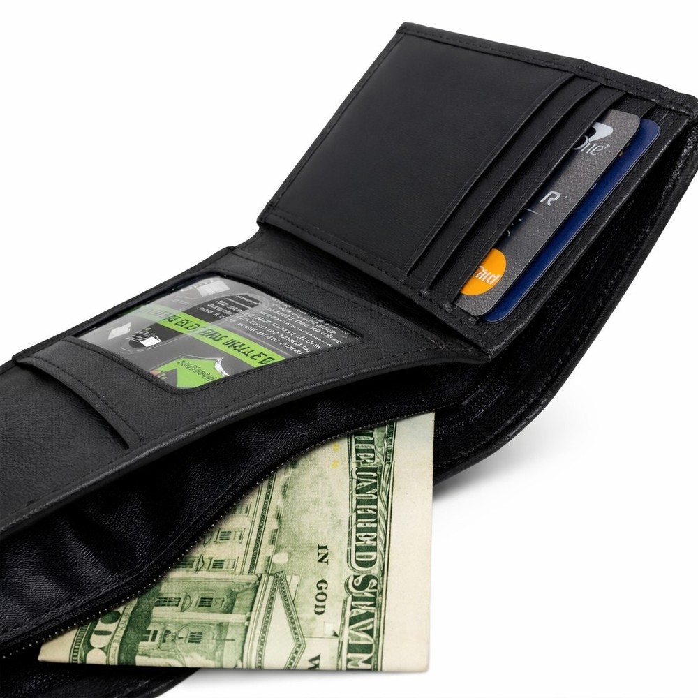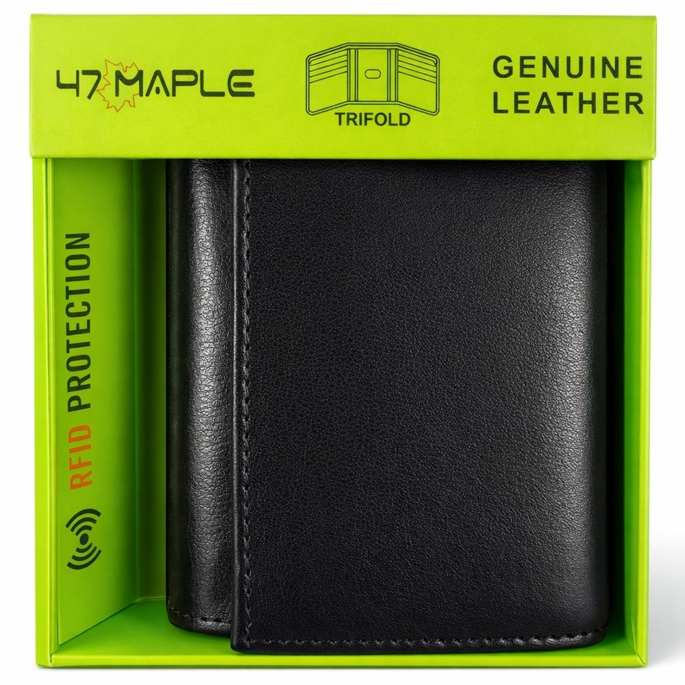 Men's Genuine Leather RFID Security Black Trifold Wallet Men's Genuine Leather RFID Trifold Wallet Trifold Holds 8 Credit Cards 1 Clear ID Window 2 Extra Slots for business cards or receipts A bill compartment and an Inside Zipper RFID Protection Comes in Box Color: Black Free Shipping with tracking