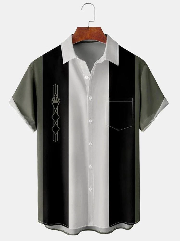 Mens Geo Print Front Buttons Soft Breathable Chest Pocket Casual Bowling Shirts