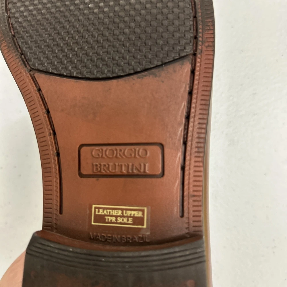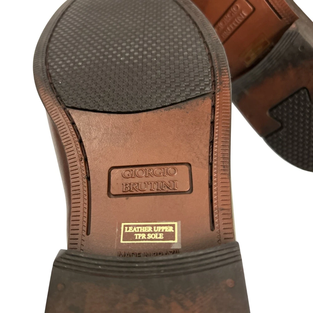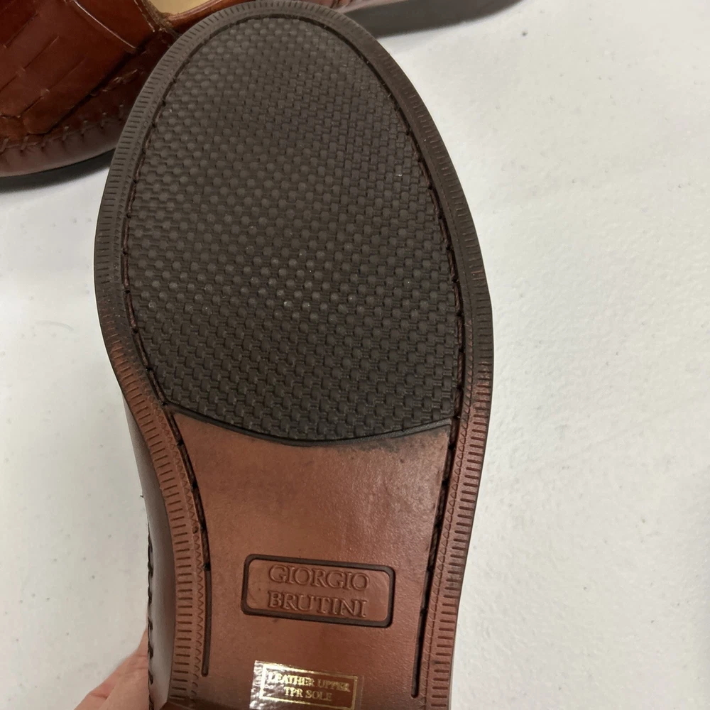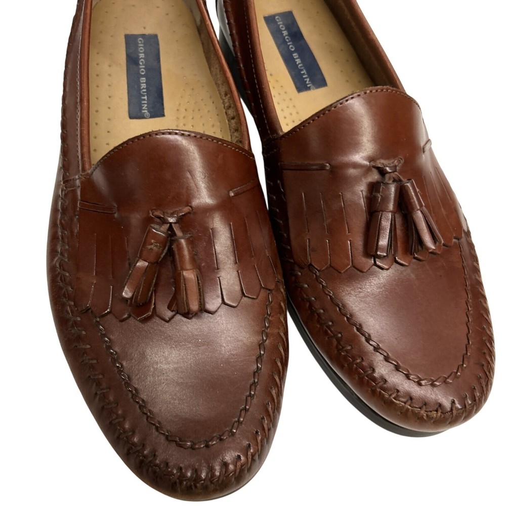 The Men's Giorgio Brutini Brown Leather Woven Tassel Loafers Shoes in size 11D are stylish and elegant dress shoes perfect for various occasions. Made with leather lining, upper material, and insole, these slip-on loafers feature a closed toe design with tasseled accents. The shoes are crafted in Brazil and have a durable rubber outsole, making them suitable for year-round wear. Ideal for holidays, birthdays, or special occasions, these loafers are a luxury choice for the modern gentleman.