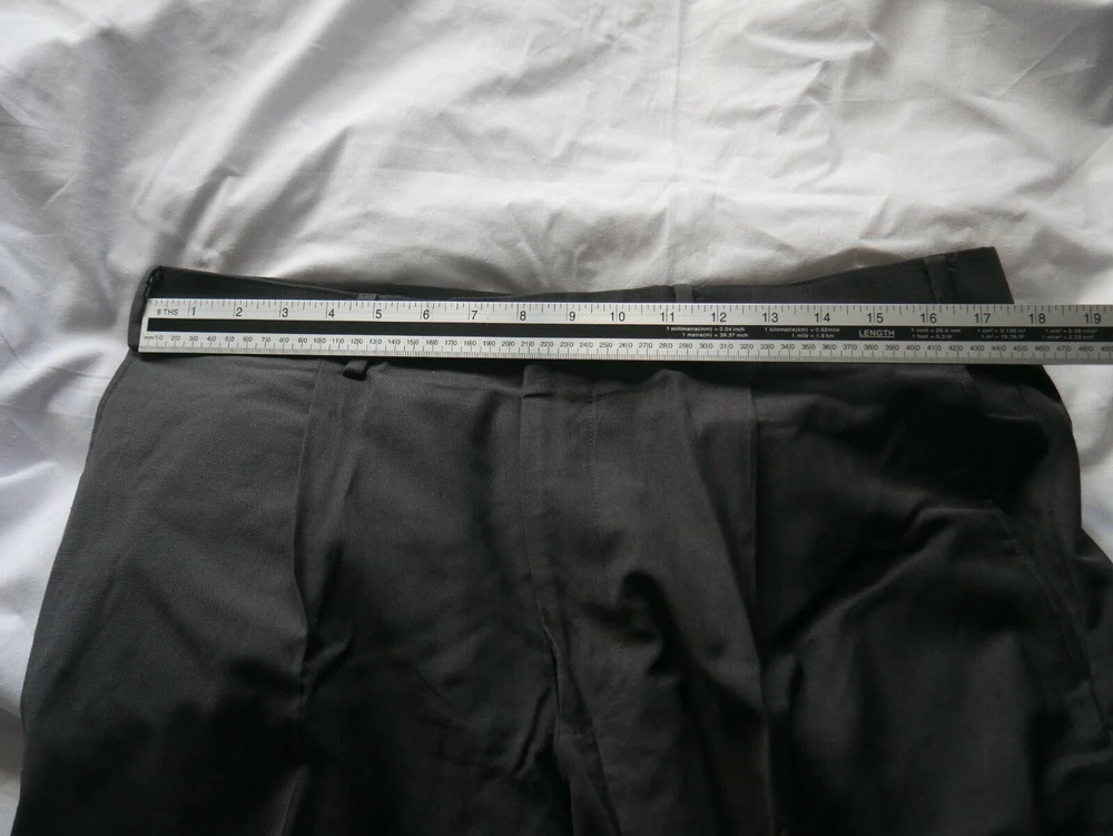 These trousers are in excellent condition. They are pleated. They have a fine check pattern all over. They are plain grey. They have the traditional pockets at the side and 2 on the back. Please see photos for material breakdown and measurements. The fabric has no stretch so measurements seen are maximums.