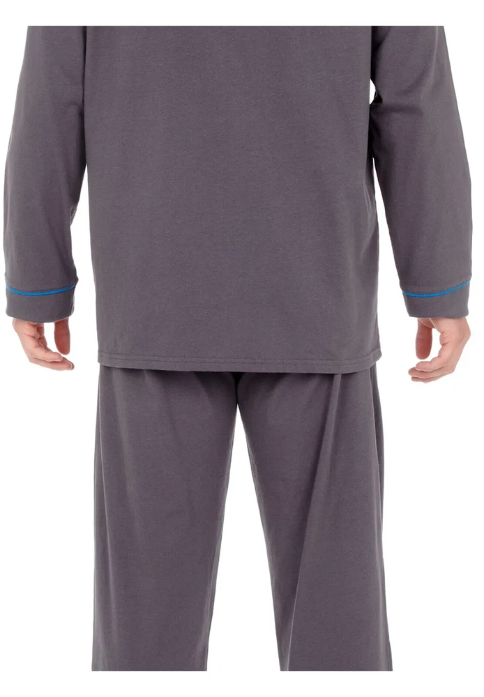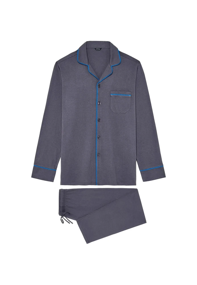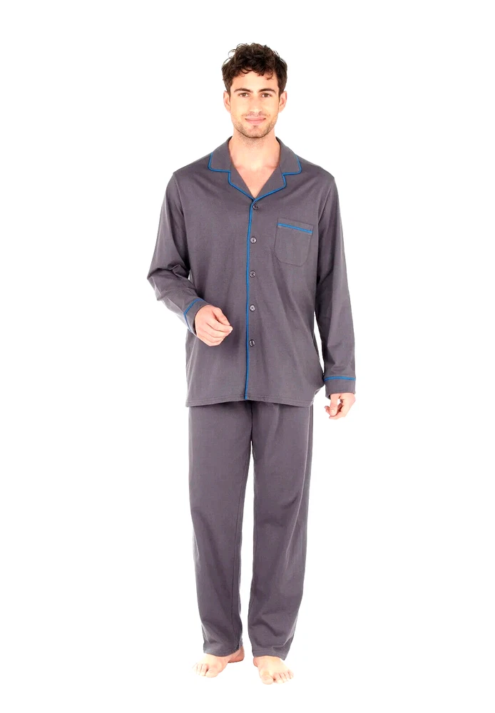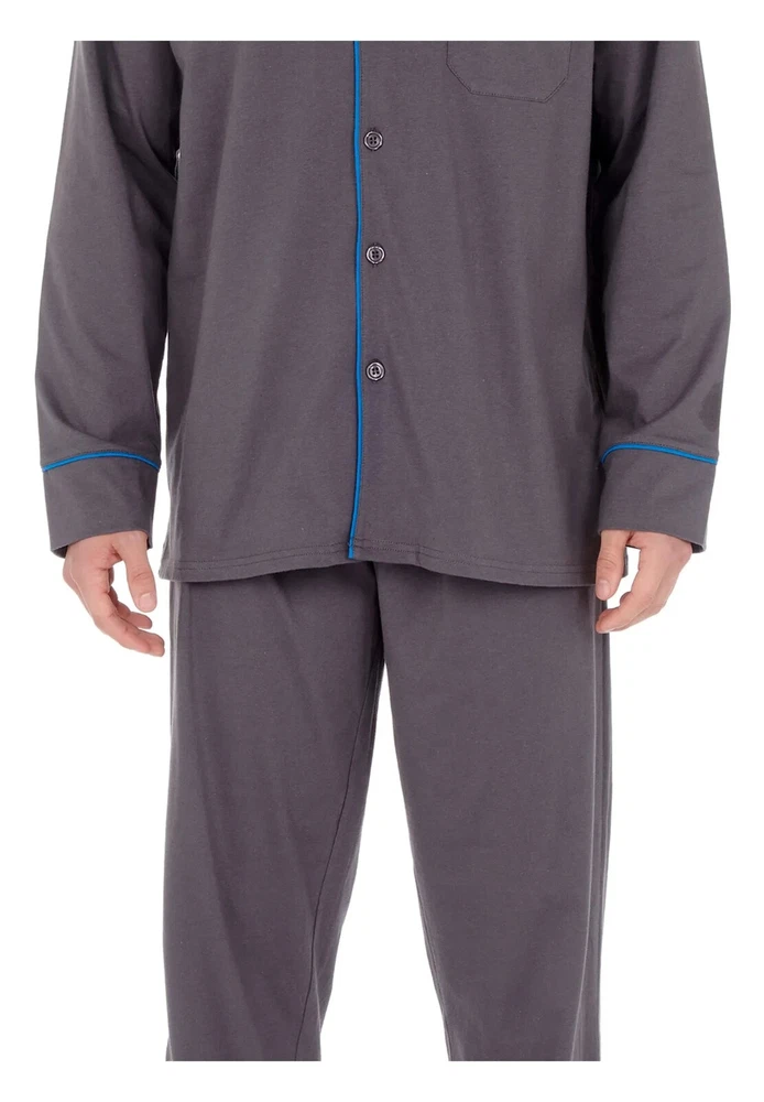 Details From the Ramatuelle Collection. Patterned button-up top with comfortable drawstring pants. 100% cotton. Machine wash. Imported. SHIRT Camp collar Plain Navy Blue Color XXL Size Long sleeves Button front Chest patch pocket PANTS Drawstring waist Side pockets