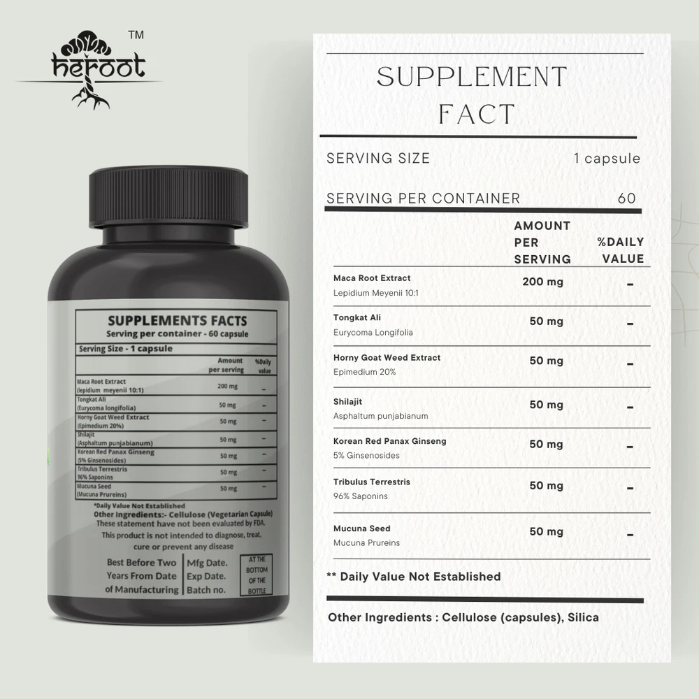Heroot Men Health capsules Heroot Men health capsules are formulated to support sexual vitality and enhance overall sexual well-being. These supplements often contain a blend of natural ingredients like maca root, Horny goat weed, Tongkat Ali, Shilajit, Panax, Tribulus, Mucna which are known to improve libido, increase stamina, and promote healthy blood flow. By addressing factors like stress, hormonal balance, and energy levels, sexual health capsules can help improve performance and satisfaction. Regular use of these capsules, alongside a healthy lifestyle, can contribute to a more fulfilling and confident sexual experience. Key Ingredients: Maca Root Horny Goat Tongkat Ali Shilajit Panax Ginseng Tribulus Terrestris Mucuna Key Benefits: Boosts Testosterone Boosts Energy Natural libido support Performance enhancer Improved Stamina Reduced Stress Enhance Mood Directions For Use: As a dietary supplement, take one capsule per day with water or as recommended by your healthcare provider. Safety Information: Store in a cool dry place Keep out of reach of children If you are pregnant or lactating or prone to any food allergy or under any medical condition consult your healthcare practitioner before use Disclaimer The above description is for information and knowledge purpose, not a healthcare professional advice. Please consult your doctor and/or pharmacist before you take this vitamin. Pregnant or lactating women, diabetics, hypoglycemics, and people with known medical conditions and/or taking drugs, should consult with a licensed physician and/or pharmacist prior to starting any supplementation program. The above statements have not been evaluated by the Food & Drug Administration. Shipping and Handling Shipping time will be 1 business day after the cleared payment We will ship by Indian Post service Shipment will take 15-30 days. Few more days for your local customs delay and formalities. For Express service additional charges will be applied. For any reason you wish to leave Negative or neutral feedback, Please contact us first and let us mutually resolve it. We care for your satisfaction and will make sure that you are happy with the transaction to post us 5**** ratings in all areas. ***Customs Information*** Heroot will not be liable for packages refused or held by customs for delivery. We request that you contact customs office and ask about import regulations and restrictions before placing your order. It is importsnt for you to become familiar with customs policies for your specific country before ordering. Customs regulations differ by country and not knowing their regulations can result in your order incurring high import duties, the delivery being delayed or even returned. Please check with your customs office to see if your country permits the shipment of the products you are planning to order from us and if any additional licenses or permits are needed. Please note: if your order is returned to us due to banned/ restricted products policy, a wrong address, refusal to pay customs fees, refusal to accept the order or because no one was there to accept the delivery of your order, we will refund your order as follow: you will be refunded the total amount of the order, minus the original shipping charge.