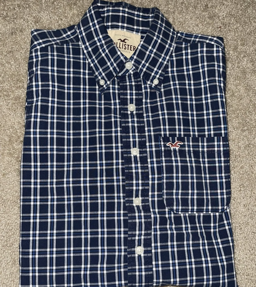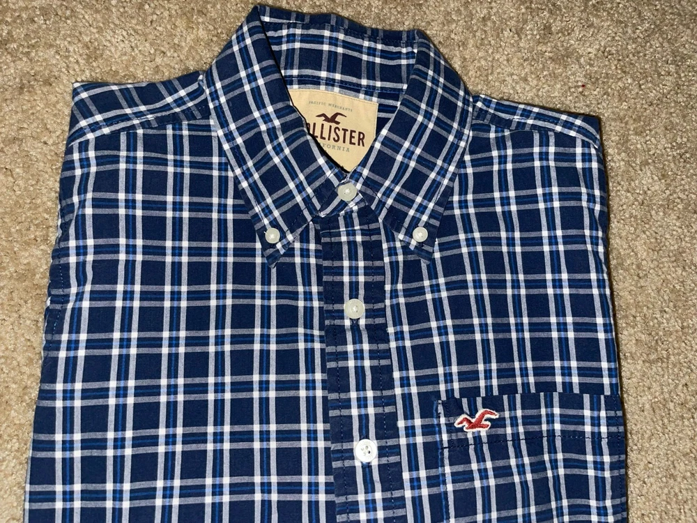 Mens Hollister Long Sleeve Plaid Button Front Shirt Size Large All cotton Great looking navy and blue multi plaid long sleeve button up shirt Pocket with logo Excellent used condition VERY NICE SHIRT FROM SMOKE FREE HOME. FAST SHIPPING WITH TRACKING INFORMATION PROVIDED.