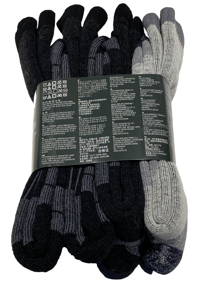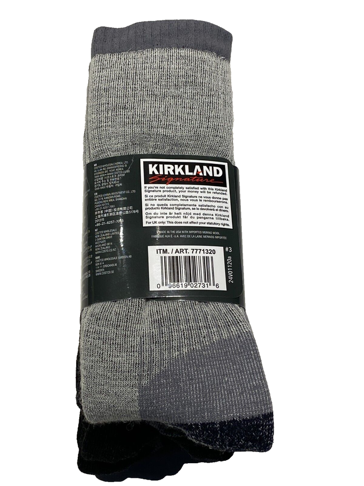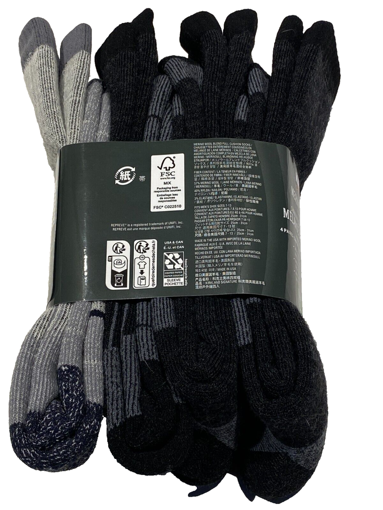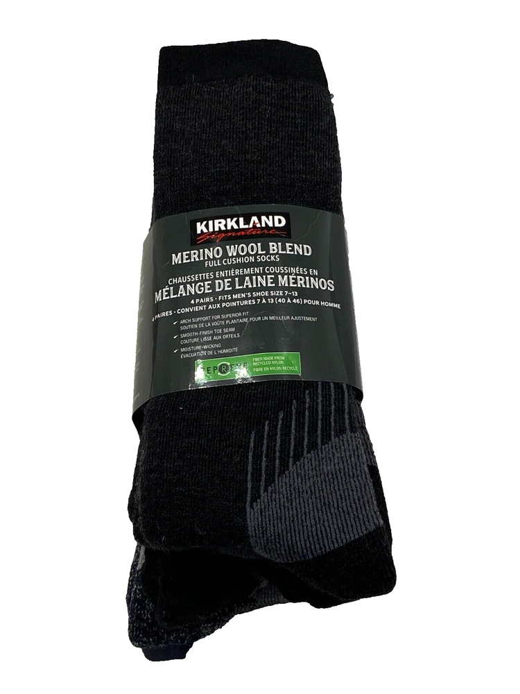ITEM DETAILS Men's Kirkland Merino Wool Blend Socks 4-pair fits Shoe Size 7-13 Size fits shoe size 7-13 Color: Black and Gray Item #7771320 Arch Support for Superior Fit Smooth Finish Toe Seam Moisture Wicking Brand New First Quality The digital images we display have the most accurate color possible. However, due to differences in computer monitors, there may be variations in color between the actual product and your screen. Manufactured by Kirkland Signature SHIPPING We strive to process all orders within 1 Business Day or Less . Items under 16 oz will be shipped via Priority Mail or First Class . Items over 16 oz will be shipped Parcel Ground or using Calculated Shipping to ensure the most Cost-Effective means for the customer. RETURNS Return Shipping will be paid by the Buyer unless otherwise specified. Please contact us if you have any issues or concerns so we can resolve them. We appreciate your business and work to exceed your expectations! No restocking fees . THANK YOU!! Please Leave Feedback, it is Appreciated!!