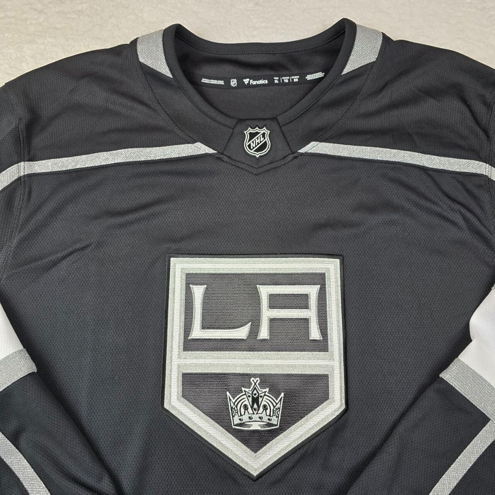 Show your support for the Los Angeles Kings with this officially licensed Fanatics home breakaway hockey jersey. This men's size XL jersey is perfect for any fan of the National Hockey League (NHL). The black color and Los Angeles Kings team logo make it a great addition to any fan's collection. Whether you're watching the game from the stands or playing on the ice yourself, this jersey is a must-have for any true hockey fan.