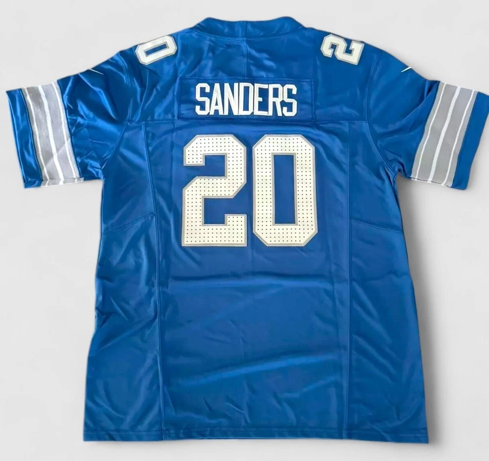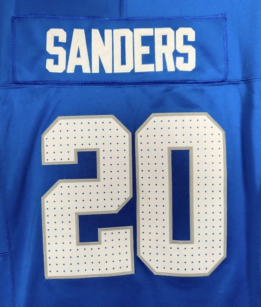 Barry Sanders Detroit Lions throwback blue jersey brand new with tags Men's size large: width across chest - 24" / length - 33" Fully stitched jersey Shipped through USPS, delivery in 1 - 2 weeks 30 days returns accepted, contact me with any queries