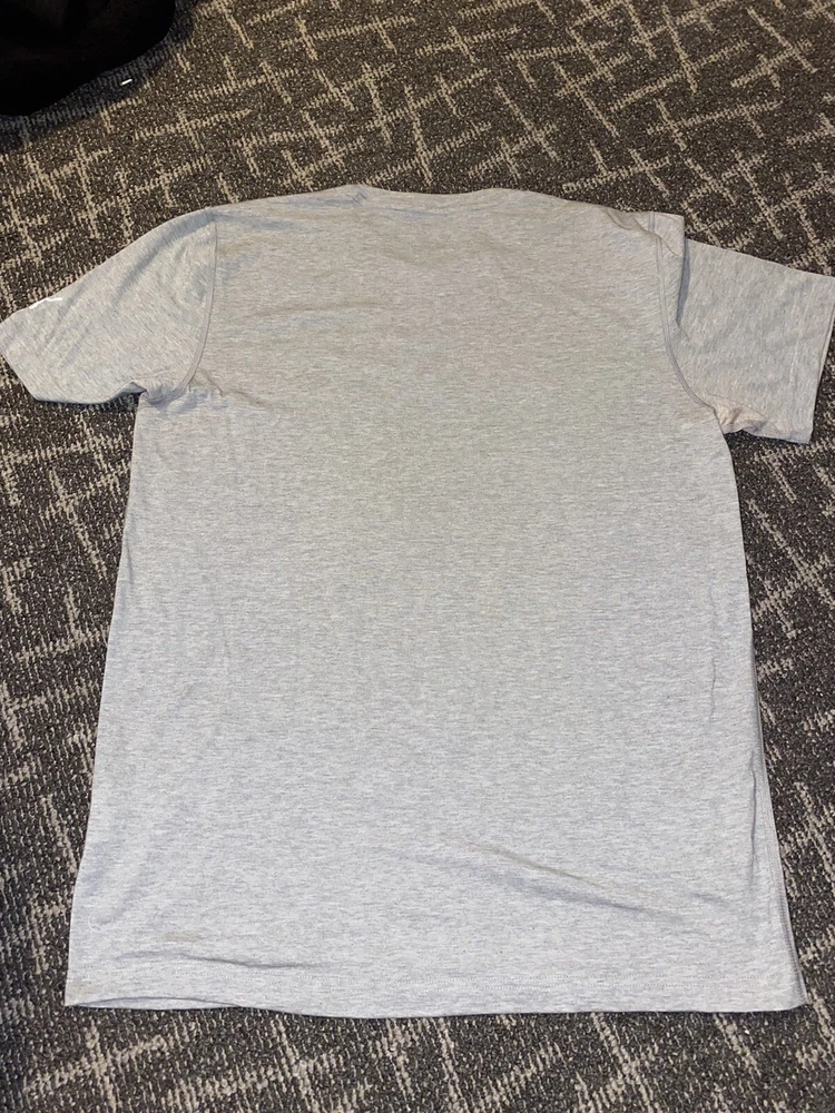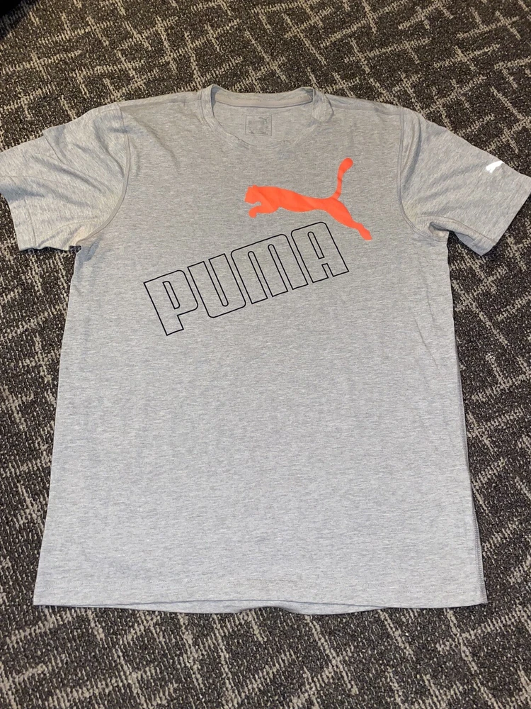 Mens Large Puma T-Shirt Tee Logo Shirt Grey Athletic Shirt Sleeve. Slight discoloring jn right arm pit as photographer. Never worn though ... not sure where the discoloration came from. New