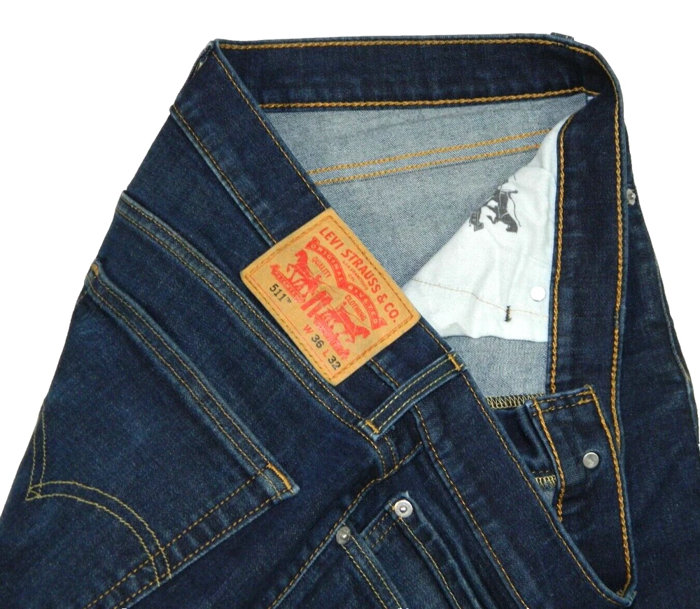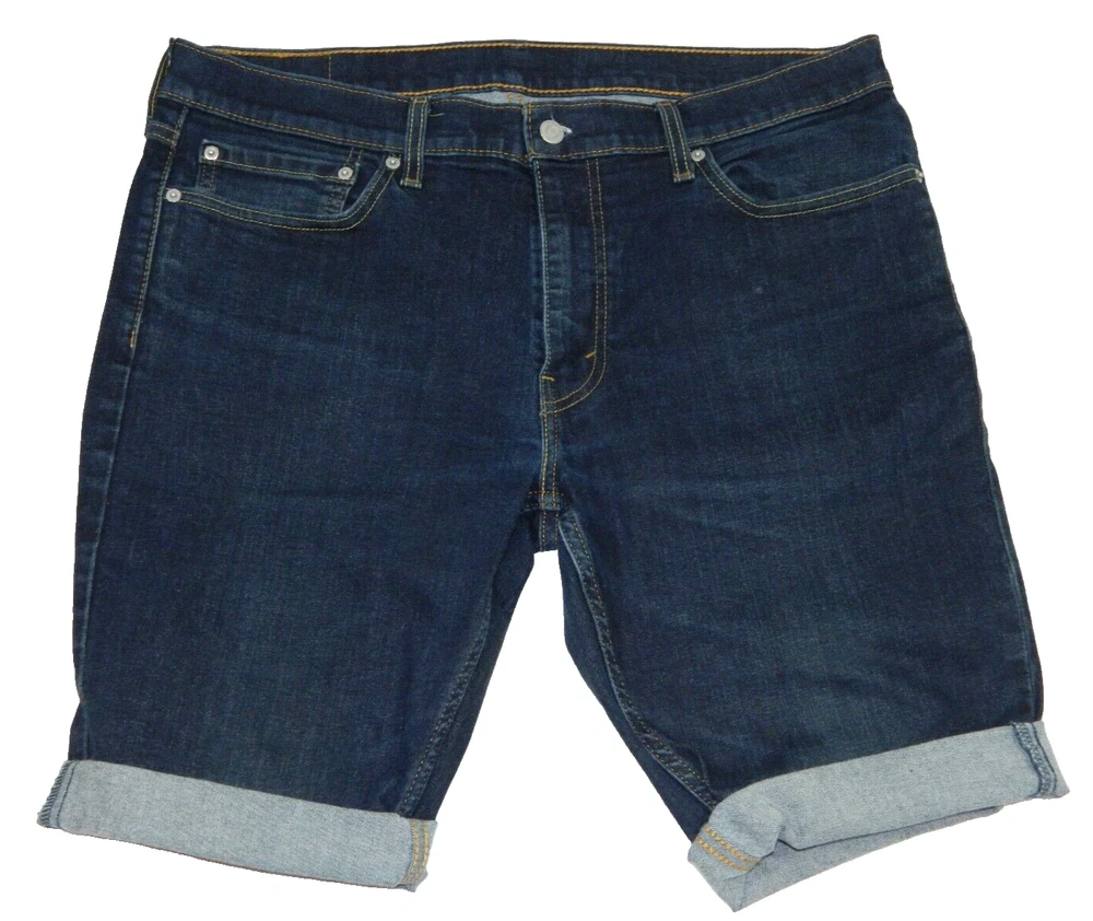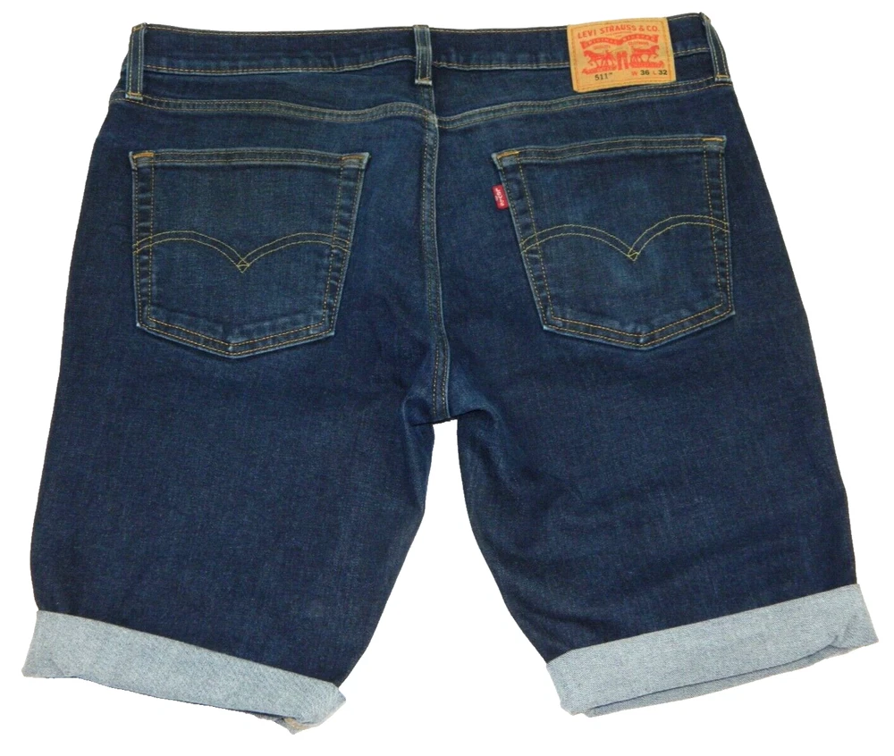 Newer pair of Levi Strauss Brand 511 Slim Skinny Dark Stretch Denim Blue Shorts. Tag Size: 36x32 (cut-off from full length jeans). 88% Cotton 10% Polyester 2% Elastane. Waist: 18.25, Inseam: 10, Front Rise: 10.75, Leg Opening: 8.5. Clean cut-off cuff rolled for the look you see. Minor fade or wear. Nice! BWOA1