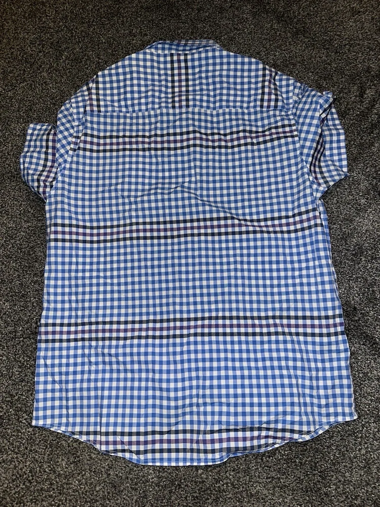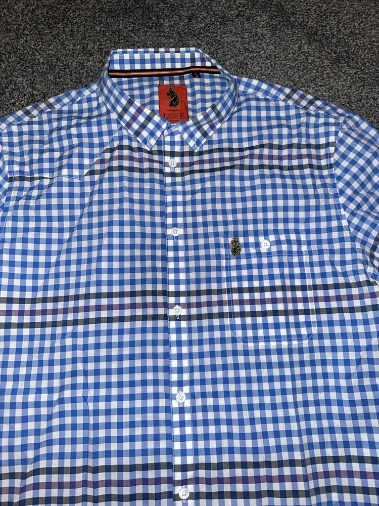 Elevate your wardrobe with this stylish Luke men's shirt in a classic blue and white check pattern. Made from high-quality cotton canvas fabric, this regular fit shirt features short sleeves and a collared neckline with a button-down closure. The shirt is adorned with a subtle logo accent on the chest, adding a touch of sophistication to the overall design. Perfect for any occasion, this shirt is versatile and can be worn for travel, weddings, parties, or even as workwear. The size is Large and the shirt is suitable for men. With its timeless design and quality fabric, this button-up shirt is a must-have addition to any fashion-conscious man's wardrobe. The shirt says size 2 but pit to pit is 23” Note This item is used, so please don’t expect perfection. May have minor faults but generally in good used condition unless stated. Any questions please don’t hesitate to get in touch Thank you as always