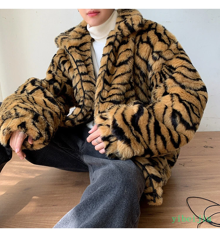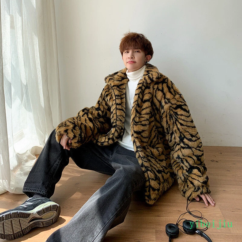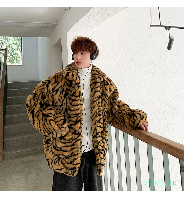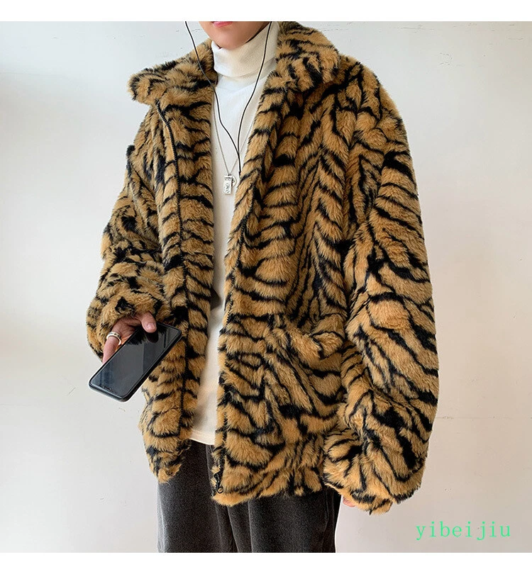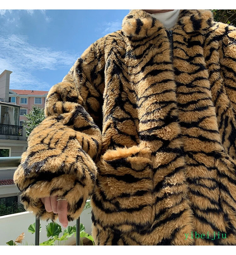 Men's Mid Length Fur Coats Jackets Hip Long Winter Clothes Tiger Striped Print