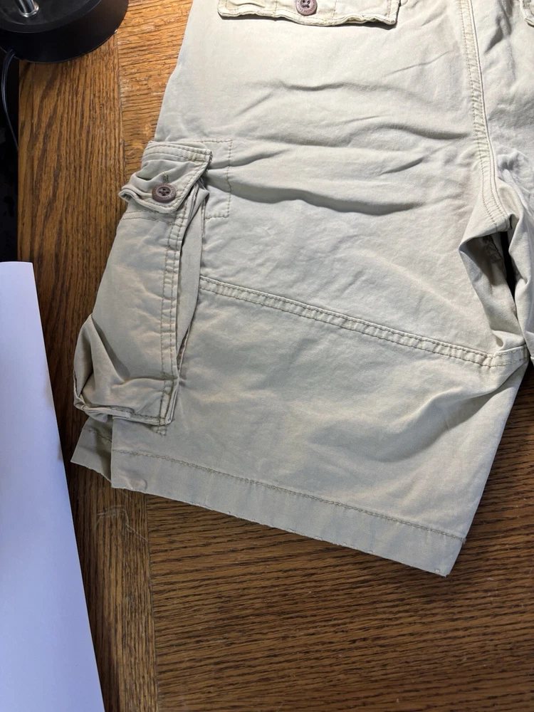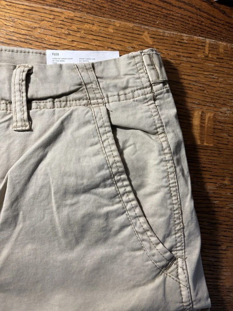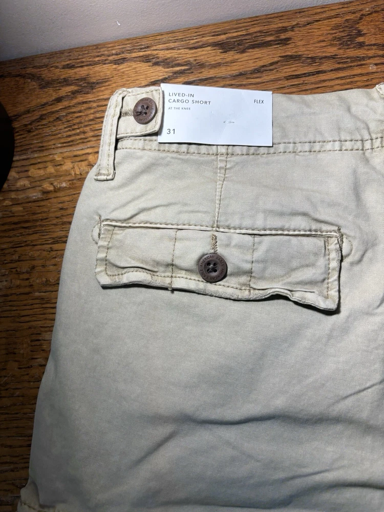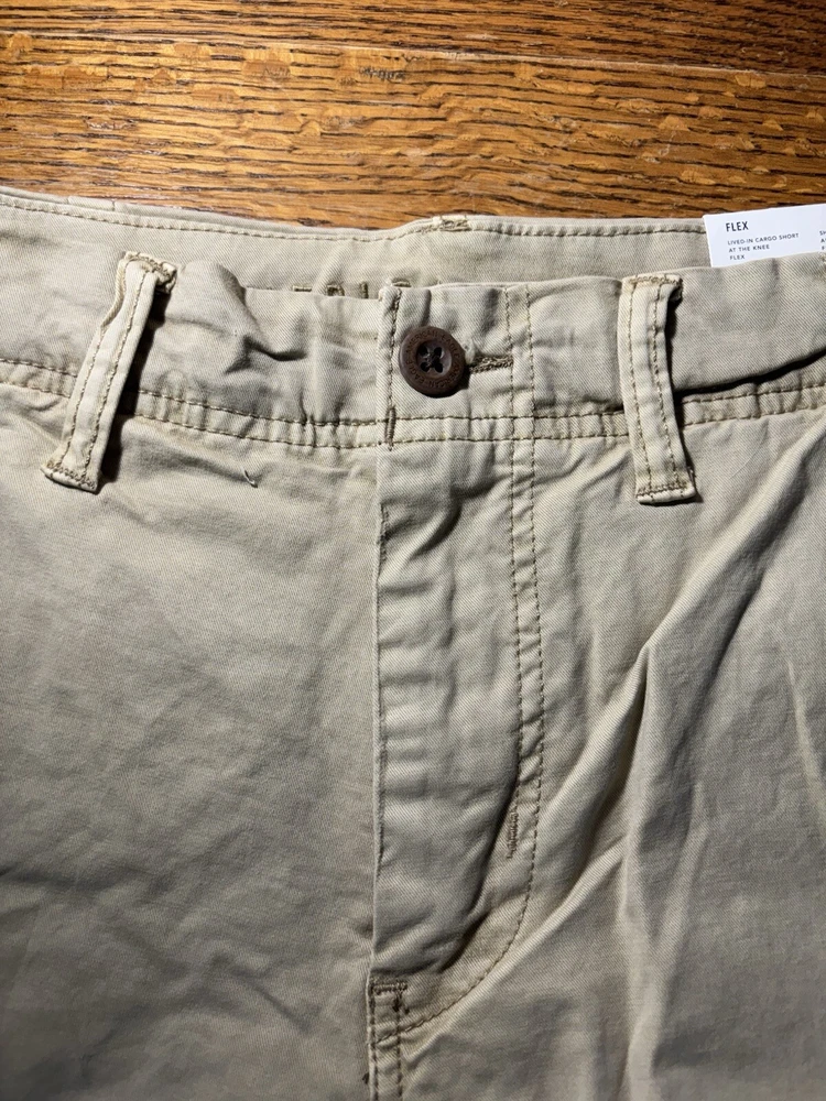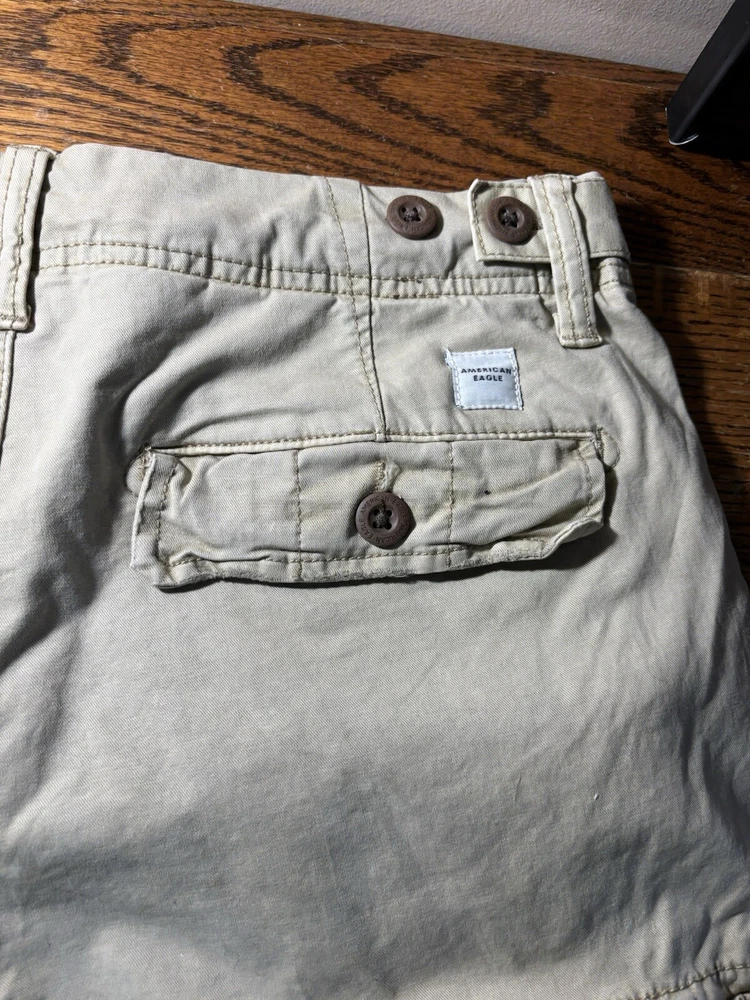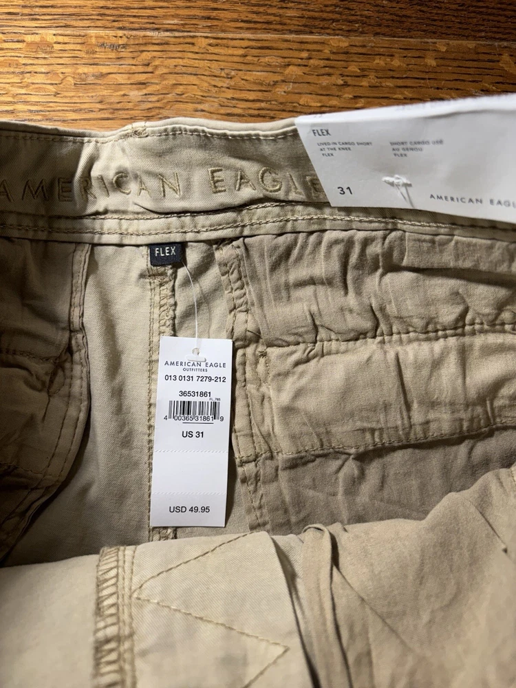 Elevate your casual wardrobe with these American Eagle Flex cargo shorts in beige. These shorts feature a solid pattern, zip closure, and flat front. The cotton and elastane material with a knit fabric type and mid-rise fit make them comfortable and stretchy. The cargo pockets provide ample space for your essentials, and the button accents add a touch of style. These shorts are machine washable, making them easy to care for. Perfect for a casual day out, these shorts are a wardrobe staple for any fashion-conscious man.
