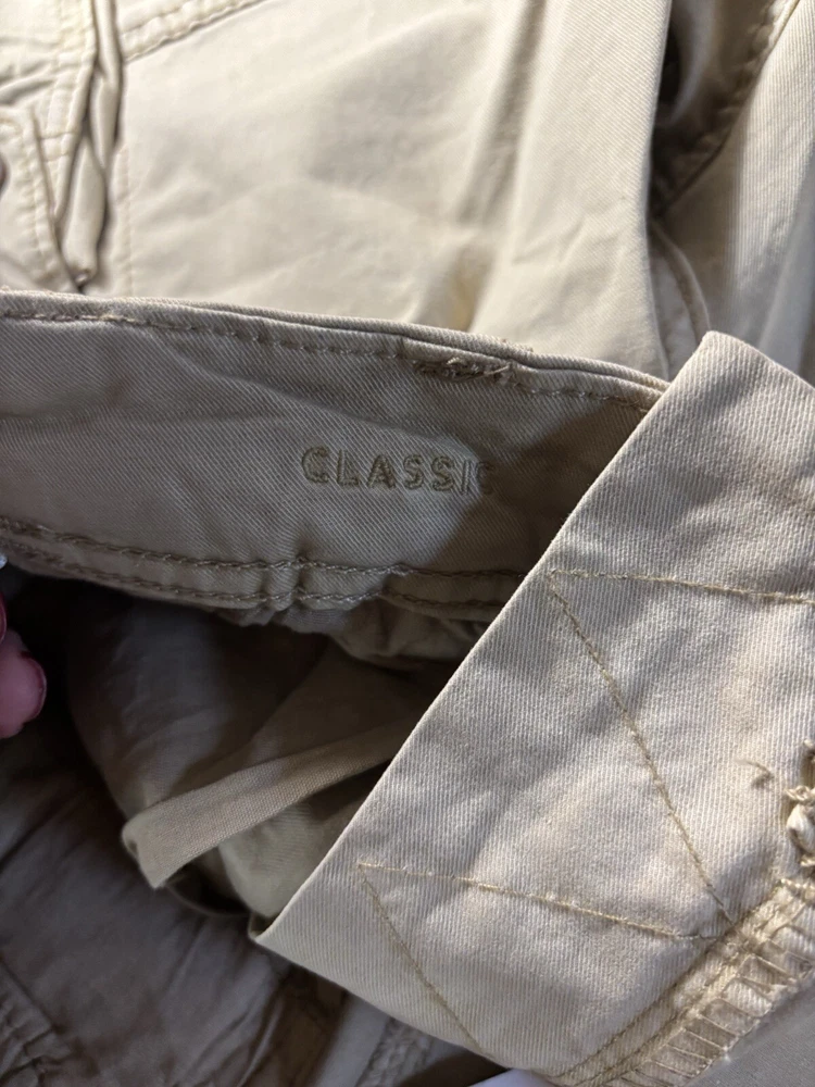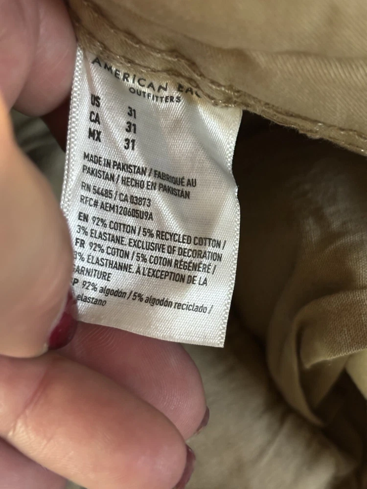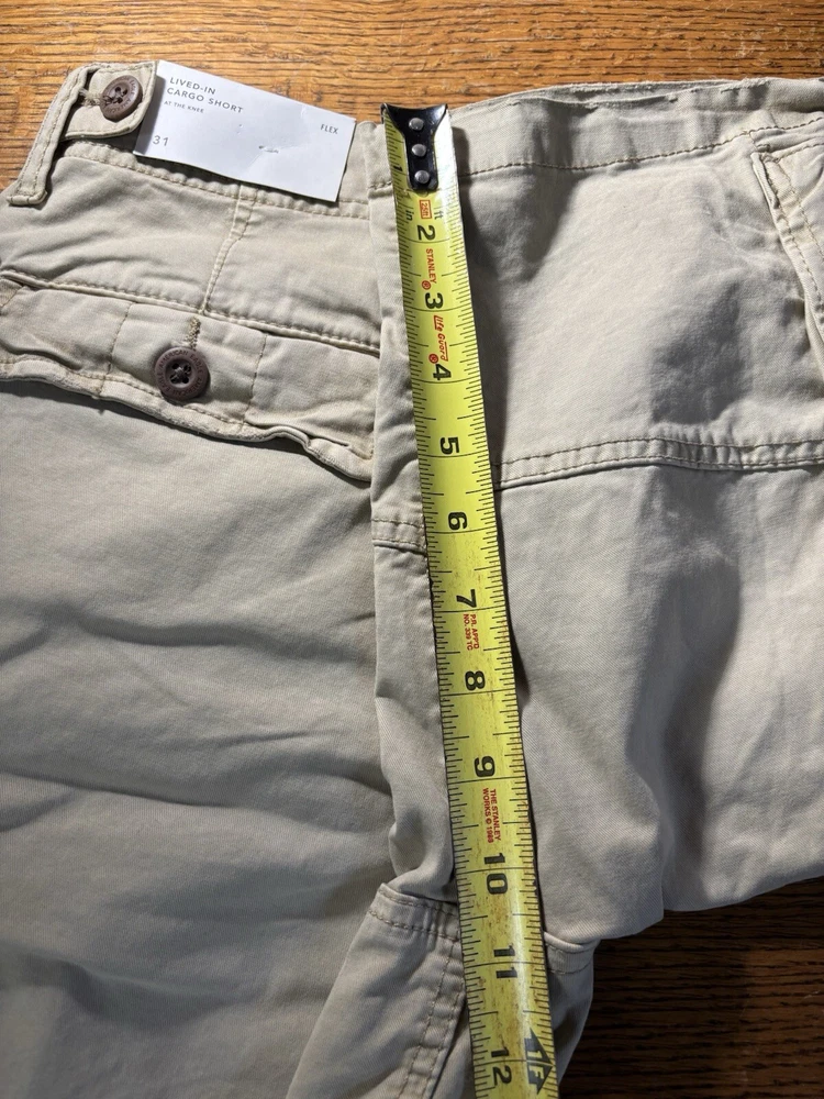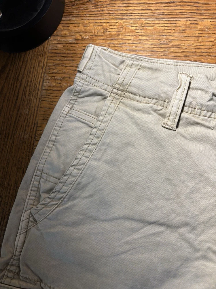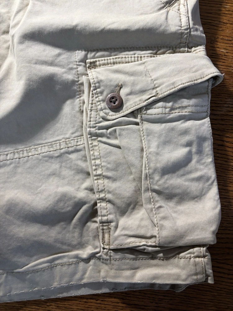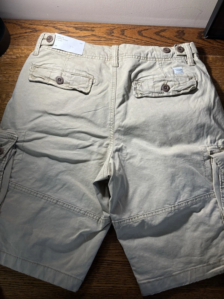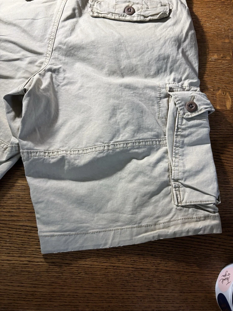 Elevate your casual wardrobe with these American Eagle Flex cargo shorts in beige. These shorts feature a solid pattern, zip closure, and flat front. The cotton and elastane material with a knit fabric type and mid-rise fit make them comfortable and stretchy. The cargo pockets provide ample space for your essentials, and the button accents add a touch of style. These shorts are machine washable, making them easy to care for. Perfect for a casual day out, these shorts are a wardrobe staple for any fashion-conscious man.
