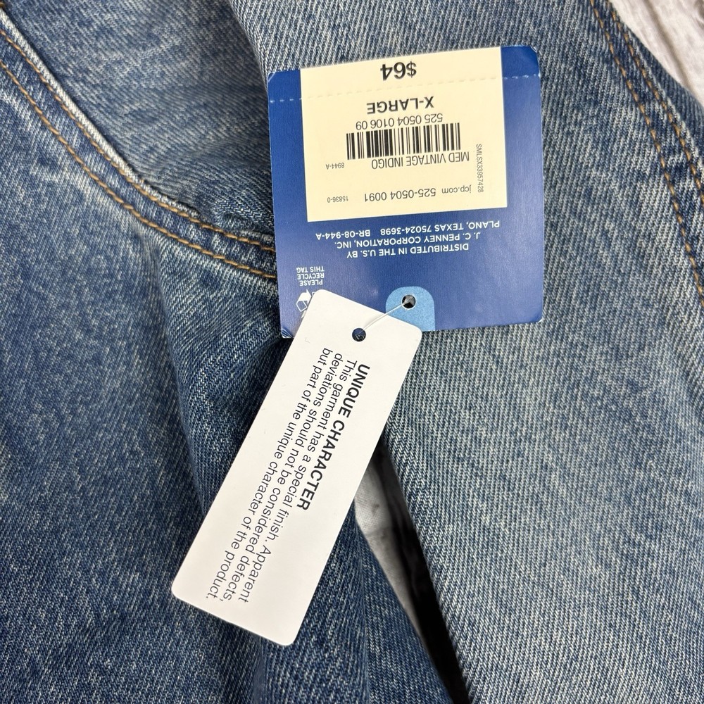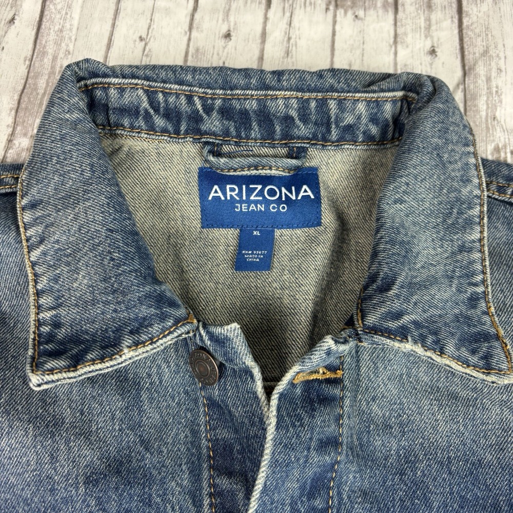 The product is a Men's NWT Y2K Arizona Jean Company denim jacket in size XL, featuring a vintage indigo color. Made of cotton denim, this jacket is designed in a classic style with a regular fit. Perfect for men looking for a timeless and stylish addition to their wardrobe, this vintage piece from the Arizona brand offers a unique and retro vibe.