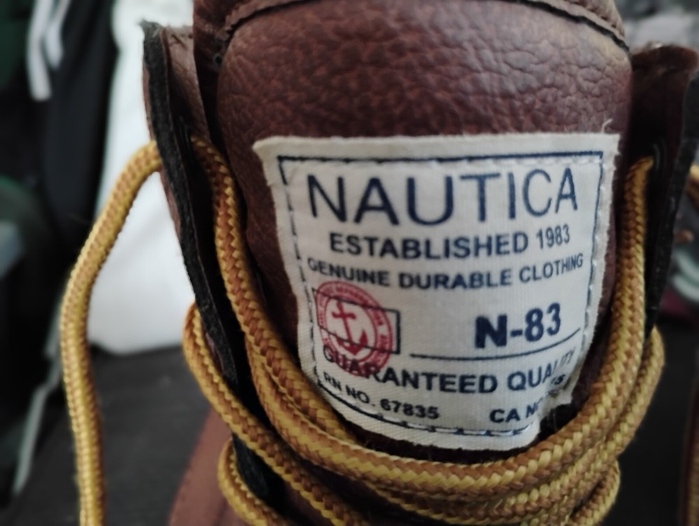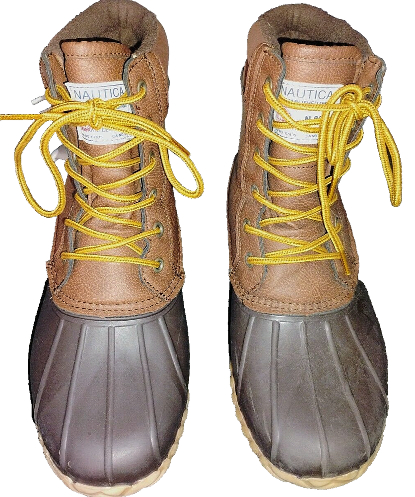 Men's Nautica Channing Leather Brown Pebbled Snow Boots in size 11. These mid-calf boots feature a drawstring closure and are designed for cold weather. Made of leather with a fabric insole, they are durable and comfortable for winter wear. The boots have a stylish solid pattern with pebbled texture, perfect for outdoor activities in the snow.