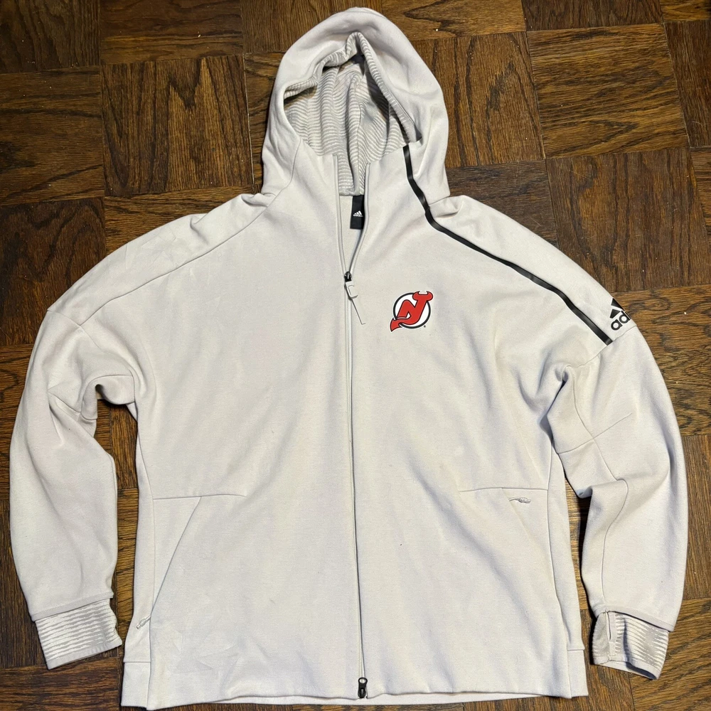 Men's New Jersey Devils NHL Adidas Gray Full-Zip Hooded Jacket Measures Size 2XL. There is a very light mark on the back barely worth mentioning (see pics). Approximate Measurements 26” pit to pit 29” shoulder to hem