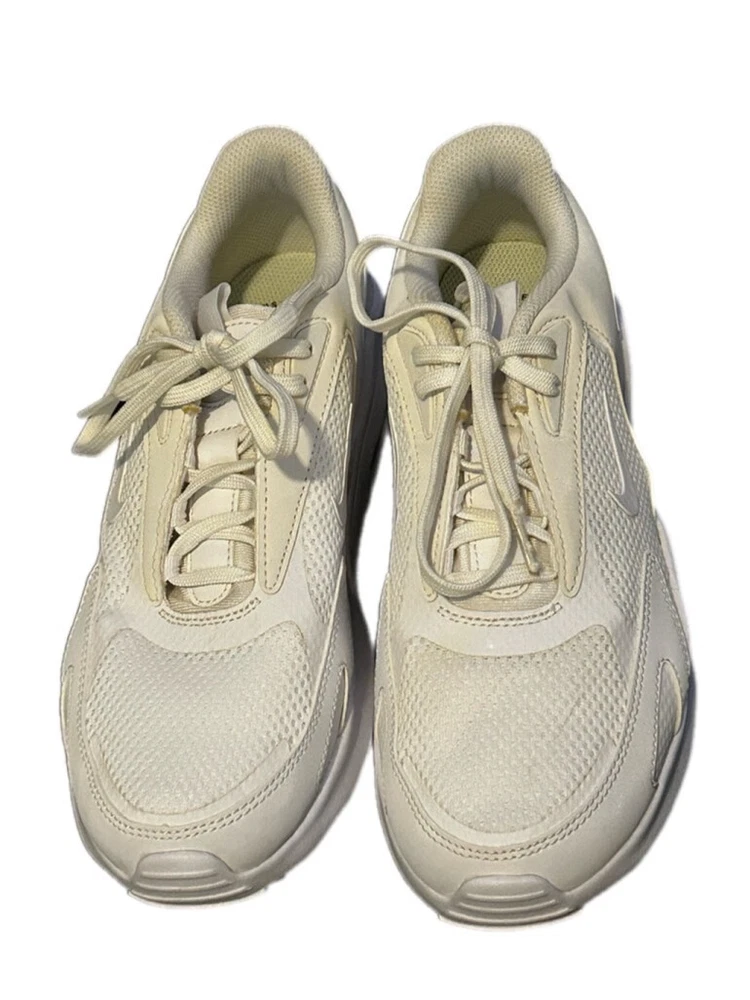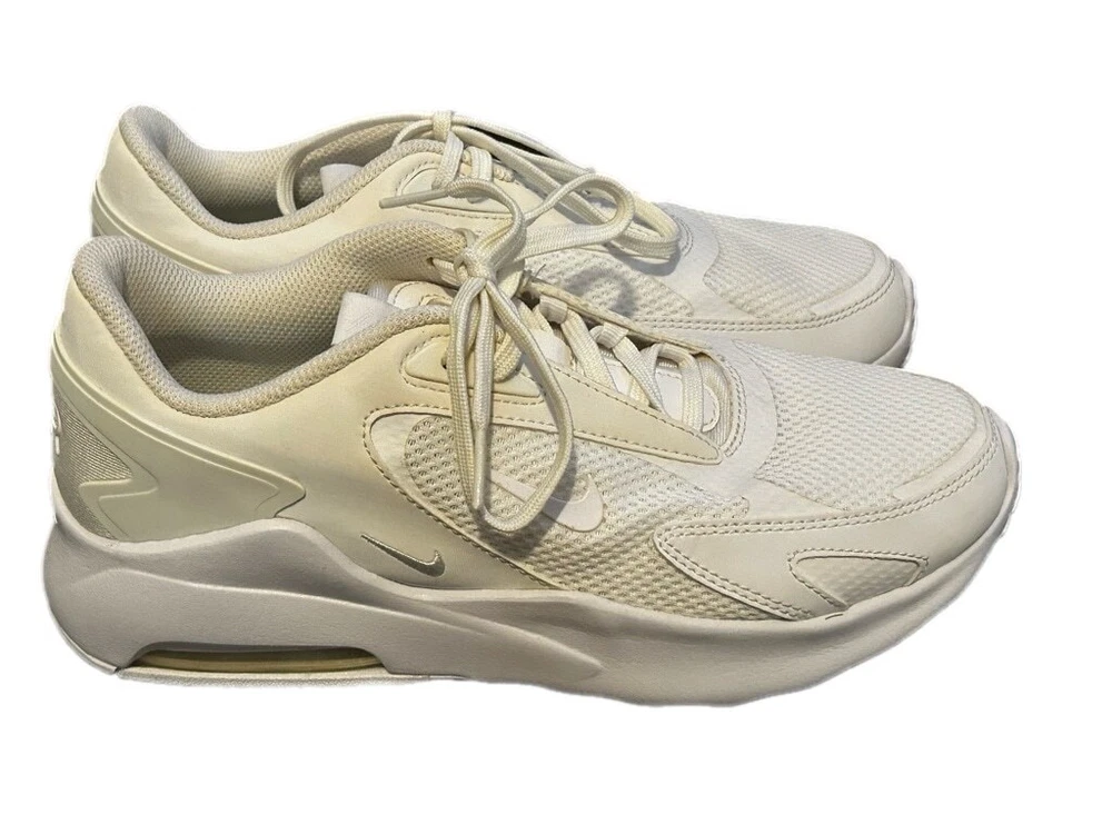These are pre-owned Nike Air Max Bolt Triple White. They feature a mesh and leather upper with a white rubber sole. The shoes have a lace-up closure and a padded tongue and collar. The Nike swoosh logo is visible on the side of the shoes. The shoes are in good condition with some minor signs of wear. The soles are slightly worn and there are some minor scuffs on the upper. The shoes are size 7.5. SERIES Air Max NICKNAME Triple White STYLE Sports SEASON All Season UPPER MATERIAL Fabric/Synthetic Leather CLOSURE Lacing SOLE MATERIAL Rubber Sole TOE TYPE Round Toe HEEL TYPE Thick bottom COLOR WAY White
