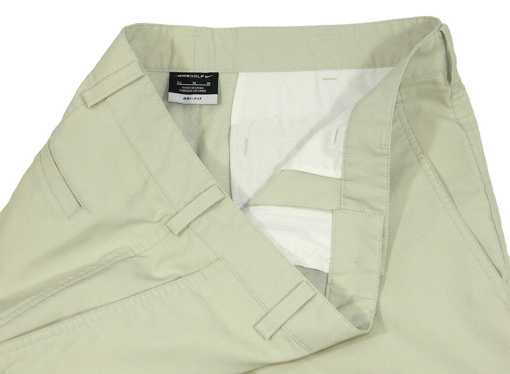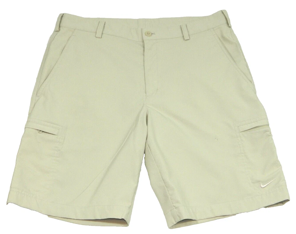 Newer pair of Nike GOLF Brand Ivory Microfiber Cargo Chino Shorts. Tag Size: 32. 95% Polyester 5% Spandex. Waist: 16.25, Inseam: 9.5, Front Rise: 11, Leg Opening: 11. Worn just below the waist. Faint mark on the left front near the cargo pocket. Not obvious. BWOA4
