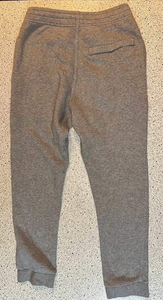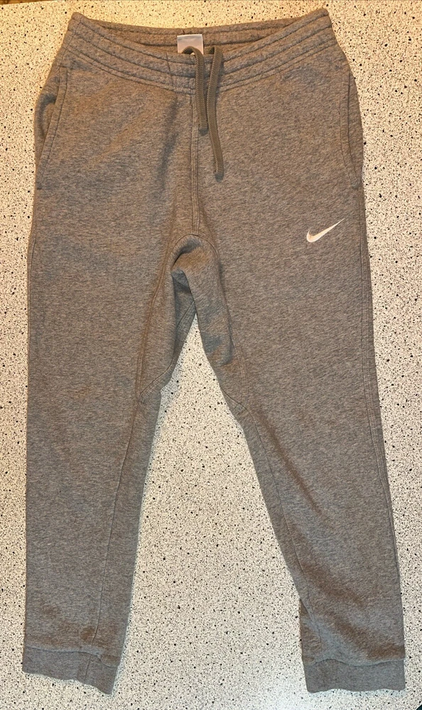 Men's Nike Sportswear Club Swoosh Joggers in size Small, featuring a solid gray color. Made of a cozy fleece fabric blend of 80% cotton and 20% polyester, these pants have a pull-on closure with an elastic waist and drawstring for a comfortable fit. With a tapered leg style, they are suitable for activewear and casual occasions, perfect for various activities like gym training, running, and more. The joggers also include pockets and a back right pocket for convenience.