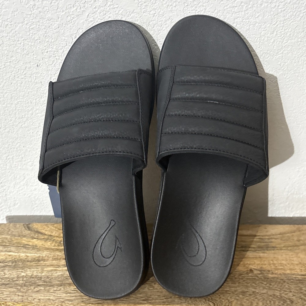 Brand new Olukai slides in six men’s 9. All black. Product highlights Designed to be your go-to recovery slide Made with water-resistant materials Extra puffy Velcro strap for a comfortable fit Oversized footbed with a super-squishy foam for instant softness and recovery Non-marking Wet Grip Rubber outsole delivers unmatched traction for sure-footed exploration. From a smoke-free home. Box S7