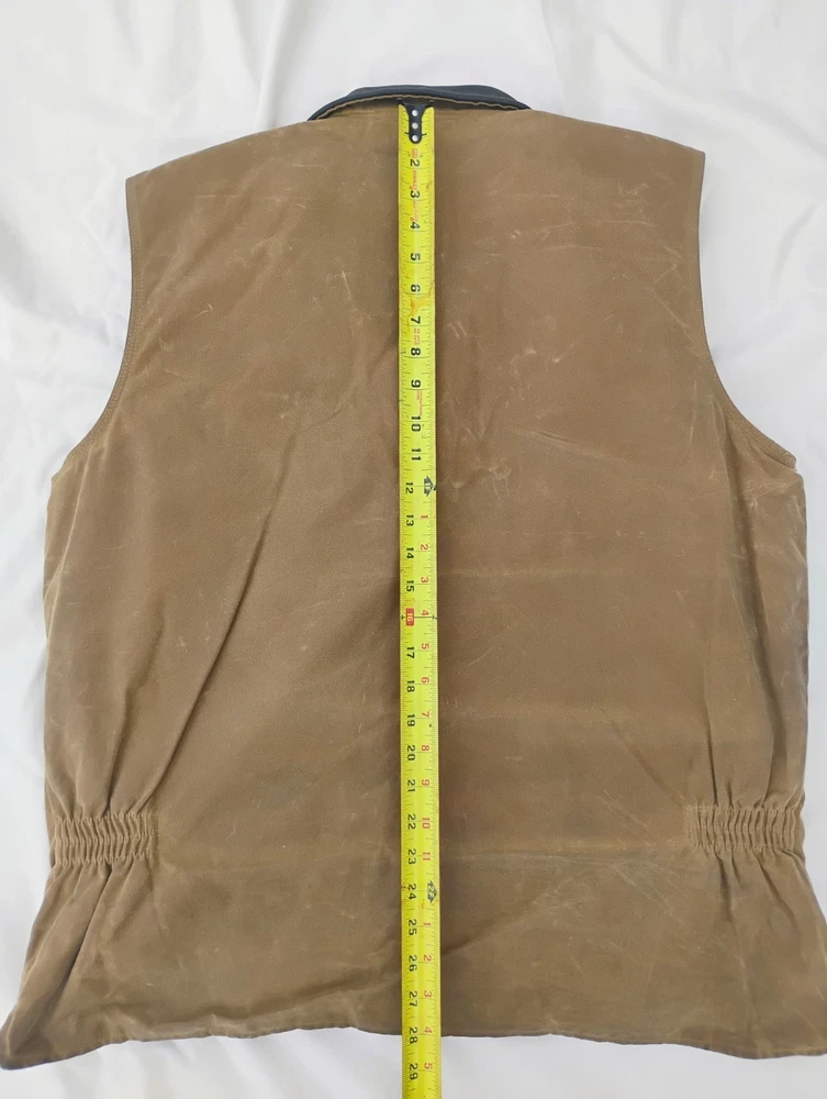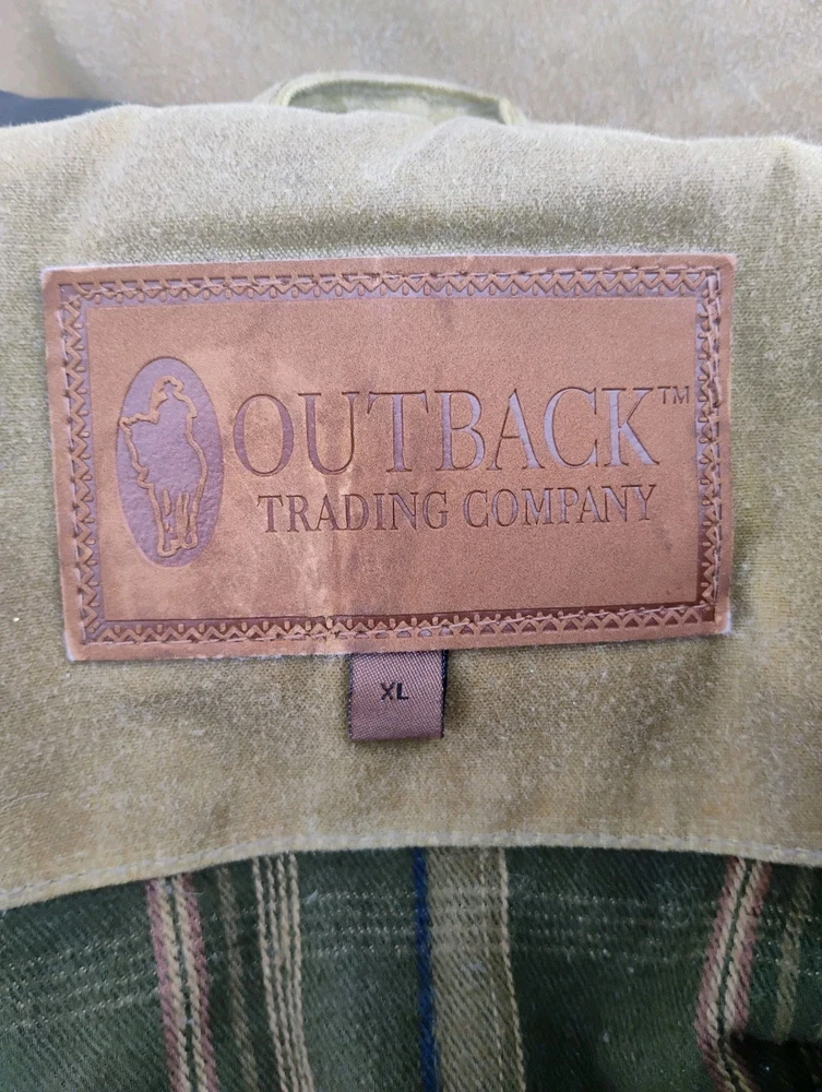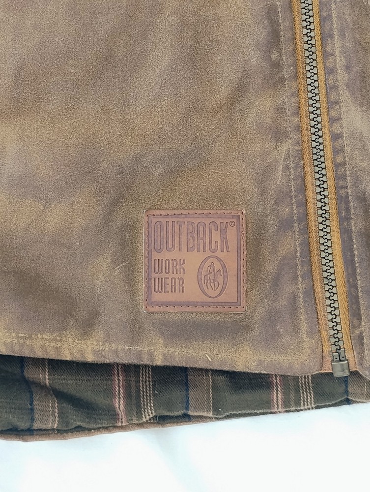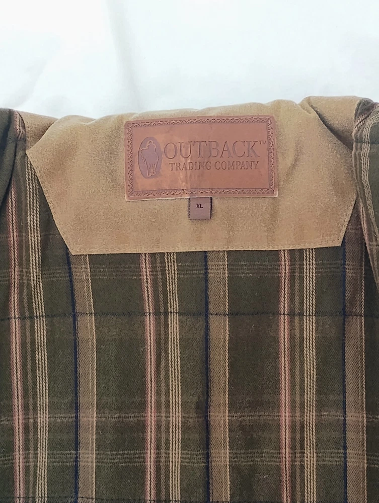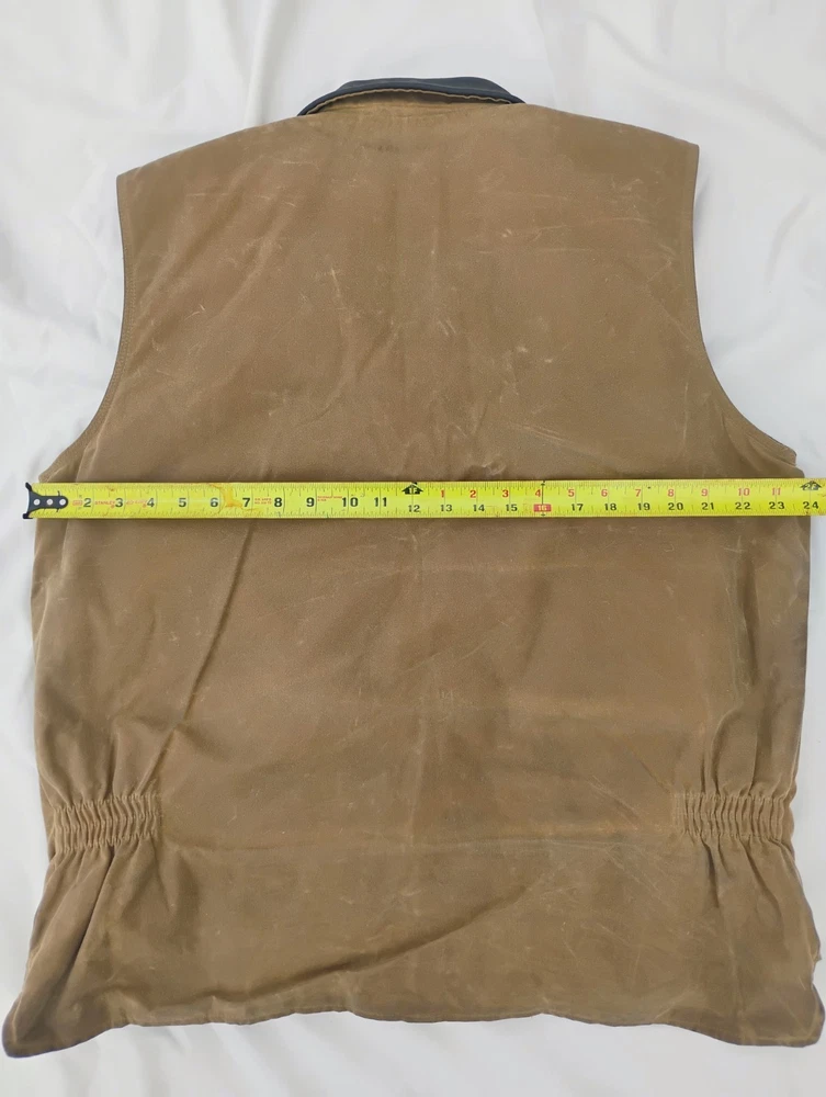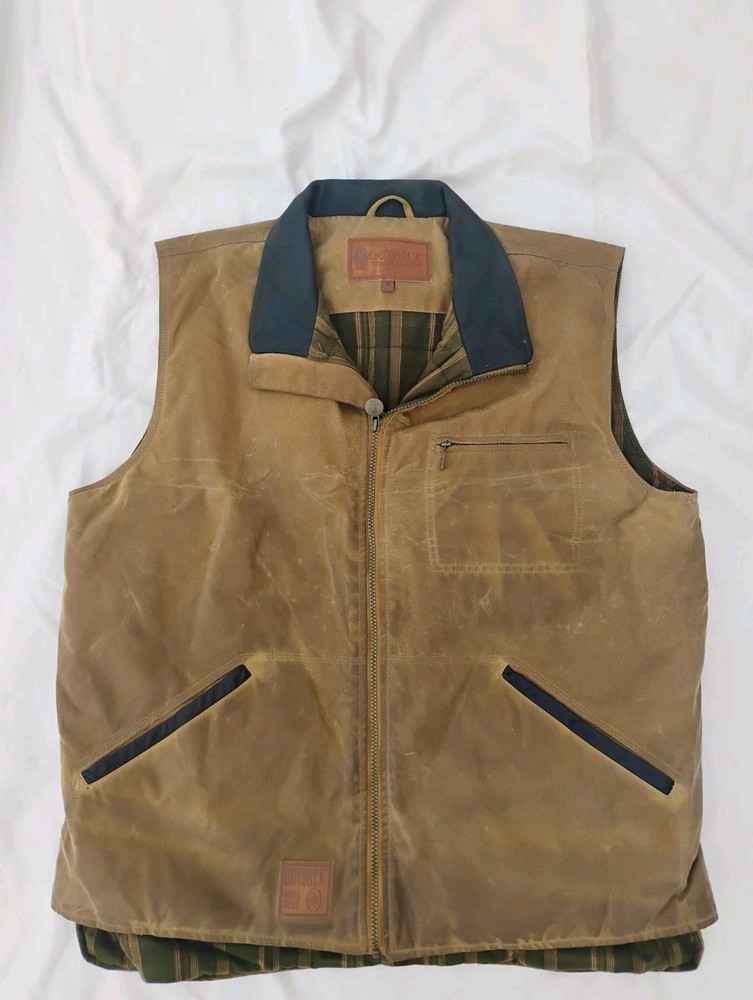 Men’s Outback Trading Co. Sawbuck Oilskin Vest – Size XL – Field Tan Up for sale is a rugged and reliable Outback Trading Company Sawbuck Vest in size Extra Large. This vest is built for those who need a durable layer for ranch work, outdoor activities, or classic western style. Key Features: Durable Exterior: Constructed from 12 oz. waterproof and breathable oilskin (waxed cotton) to keep you dry in unpredictable weather. Warmth & Comfort: Fully lined with a soft, yarn-dyed brushed flannel tricot in a classic plaid pattern. Premium Details: Features a handsome Nubuck black leather collar and leather-trimmed welt pockets. Functional Design: Includes a sturdy full-zip front with a hidden storm flap, two hand-warmer pockets, and a zippered chest pocket for secure storage. Added Coverage: Designed with an extended "dropped tail" back for extra protection when bending or riding.