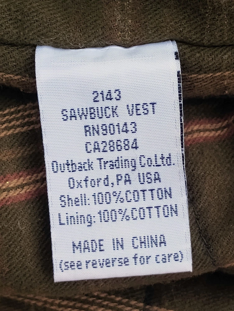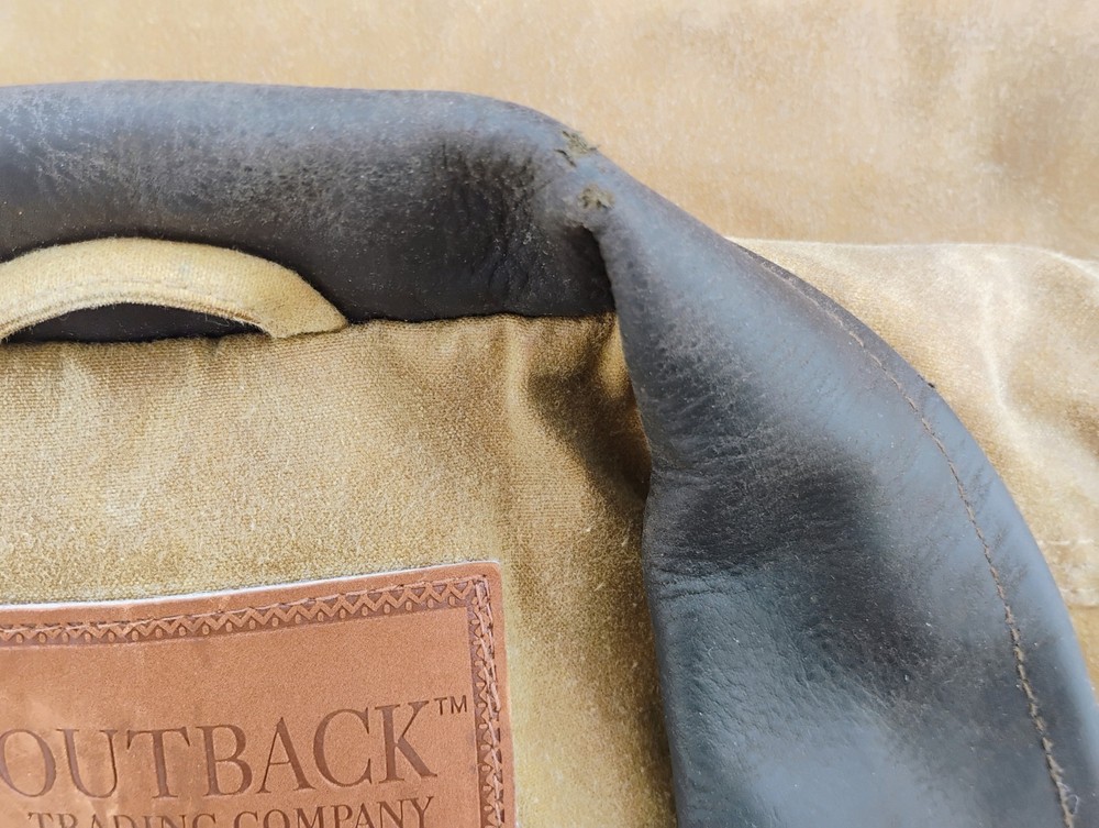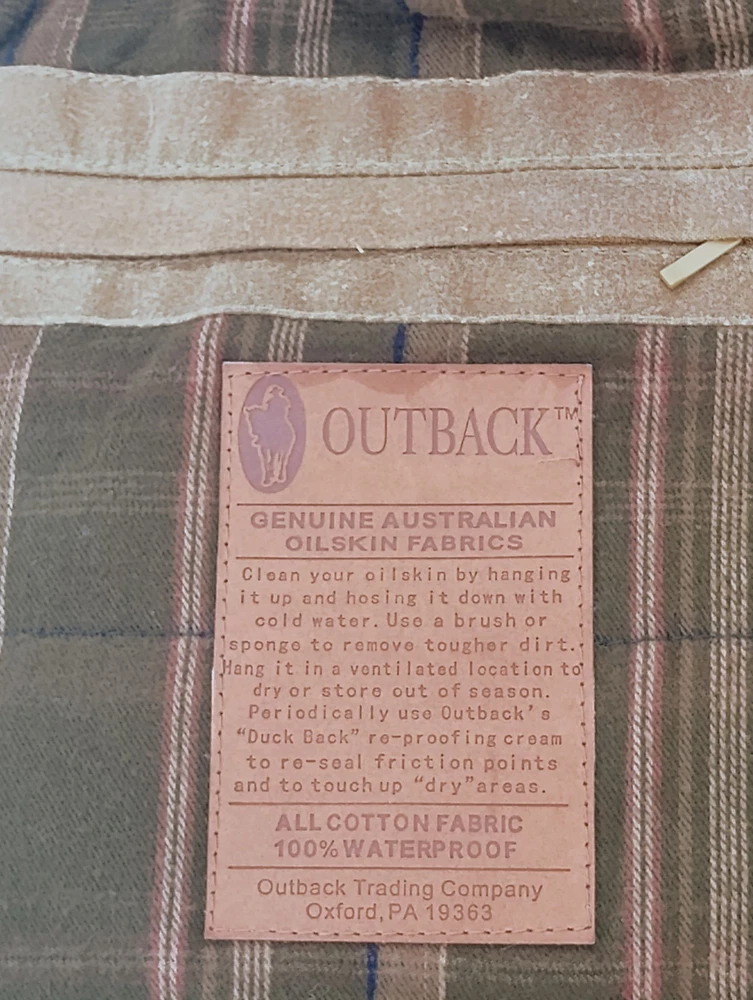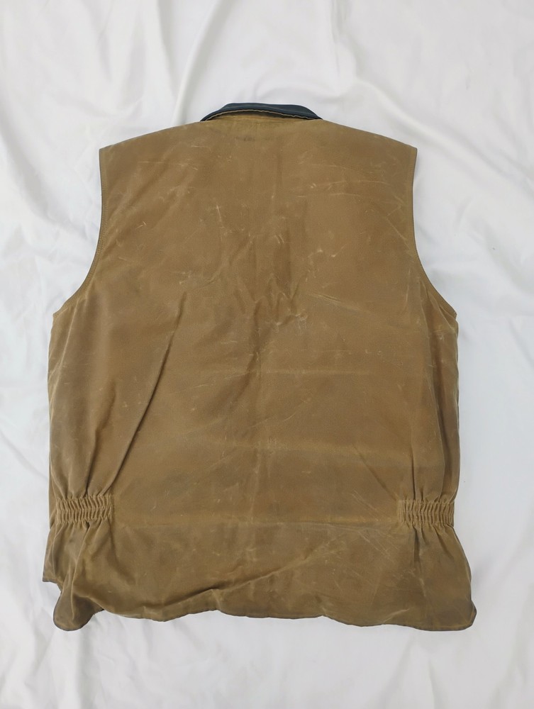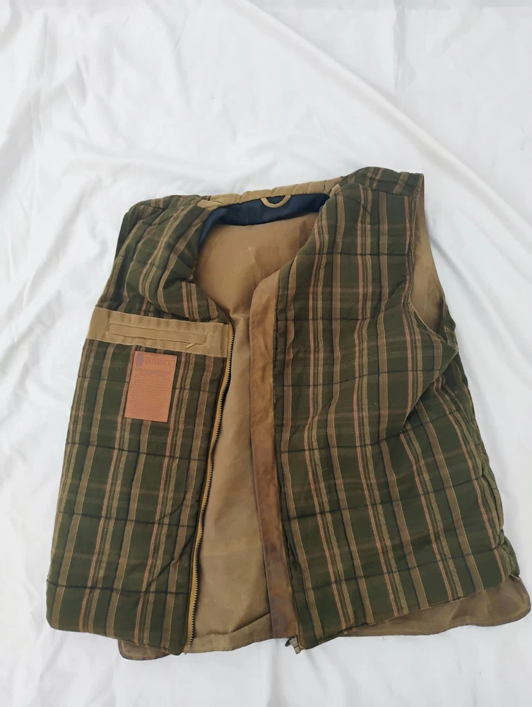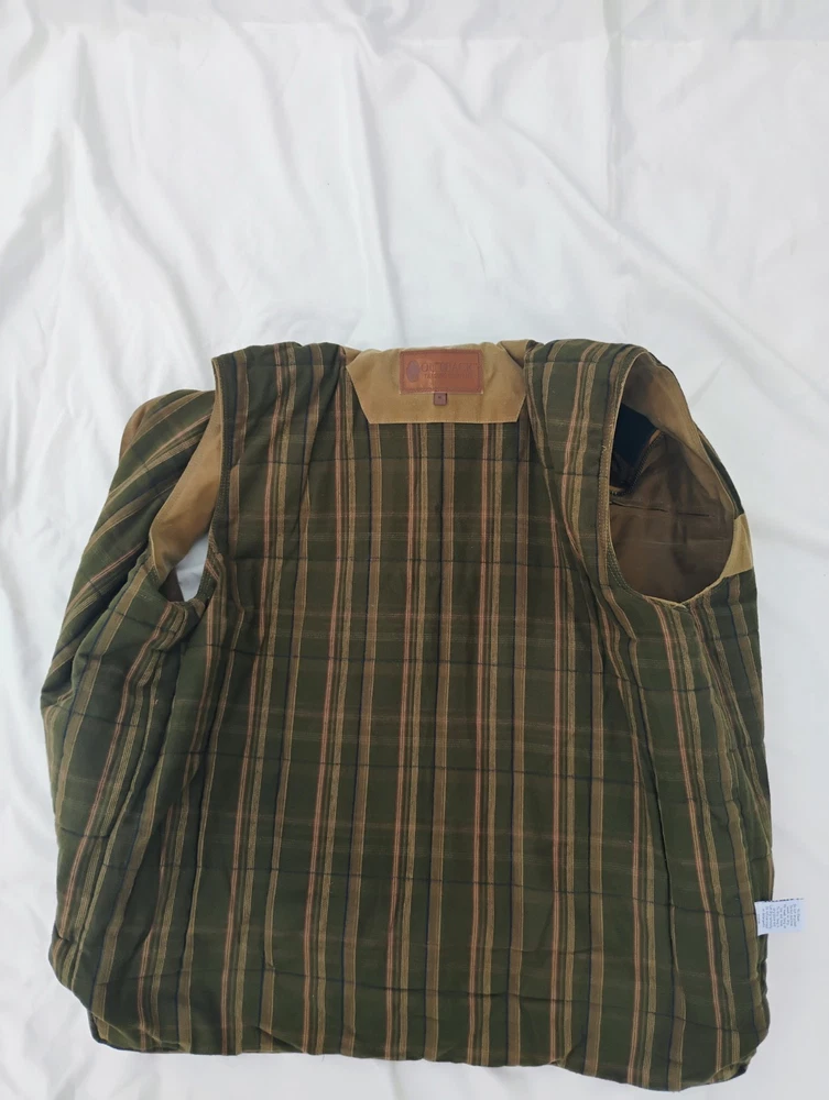 Men’s Outback Trading Co. Sawbuck Oilskin Vest – Size XL – Field Tan Up for sale is a rugged and reliable Outback Trading Company Sawbuck Vest in size Extra Large. This vest is built for those who need a durable layer for ranch work, outdoor activities, or classic western style. Key Features: Durable Exterior: Constructed from 12 oz. waterproof and breathable oilskin (waxed cotton) to keep you dry in unpredictable weather. Warmth & Comfort: Fully lined with a soft, yarn-dyed brushed flannel tricot in a classic plaid pattern. Premium Details: Features a handsome Nubuck black leather collar and leather-trimmed welt pockets. Functional Design: Includes a sturdy full-zip front with a hidden storm flap, two hand-warmer pockets, and a zippered chest pocket for secure storage. Added Coverage: Designed with an extended "dropped tail" back for extra protection when bending or riding.
