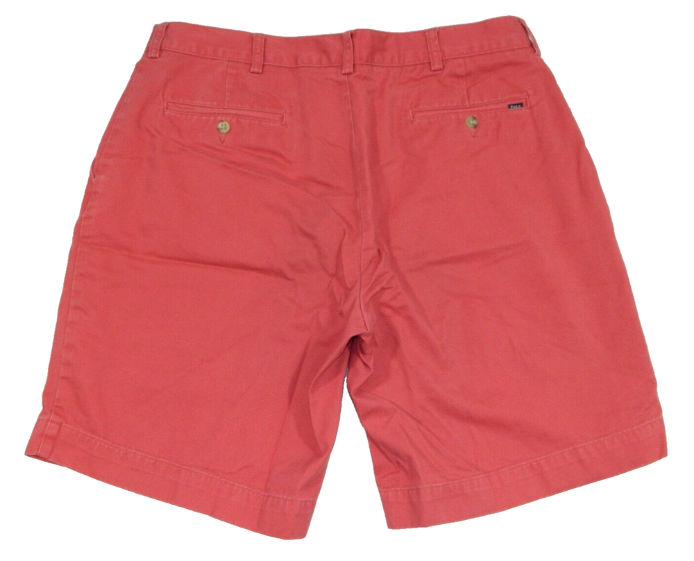 Newer pair of Polo Ralph Lauren Brand Softer Red Flat Front Chino Shorts. Tag Size: 36. No longer this size. 100% Cotton. Waist: 17, Inseam: 9, Front Rise: 11, Leg Opening: 12. Nice! BWOA1