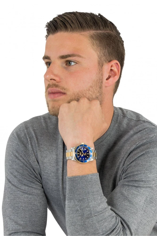 Description Stylishly classic, internal workings are forged with variations of bold movements. Plunge into any horizon using the steadfast guidance of the pro Diver. Built with confident prowess, the fortitude with which these timepieces function makes the pro Diver the quintessential in performance. Plunge into any horizon using the steadfast guidance of the Pro Diver. Built with confident prowess, the fortitude with which these timepieces function makes the Pro Diver the quintessential in performance. Stainless steel case 40mm diameter x 12.5mm thick; Blue dial; Magnified date window; Luminous hands and hour markers Japanese quartz movement, PC32 Caliber; Assembled in Japan; SR626SW battery included; Watch weight: 140 grams Steel and gold tone stainless steel band, 180mm L x 20mm W; Band is adjustable by adding/removing links; Fold over safety clasp Flame Fusion crystal; Push/pull crown; Uni-directional stainless steel bezel with blue top bezel ring; 200 meter water resistant: Suitable for professional marine activity and surface water sports. Suitable for diving.