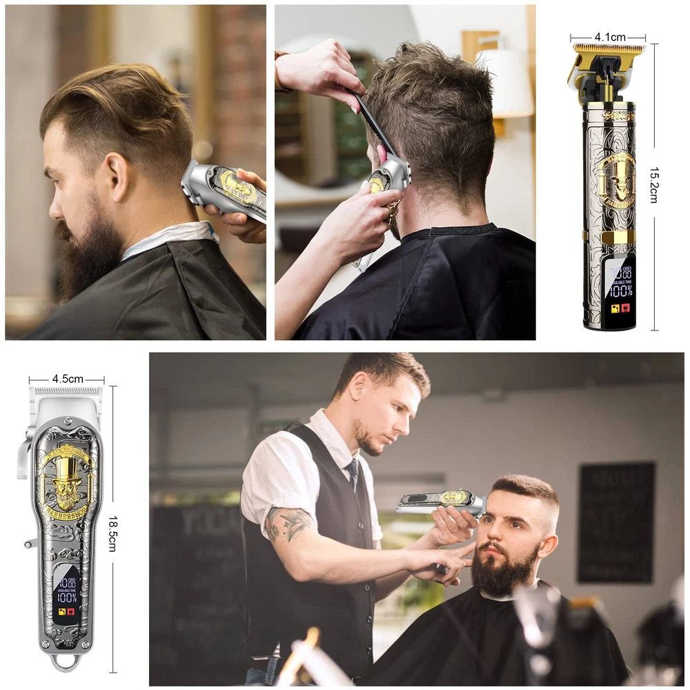 【Hair Clippers Kit for Barbers】: Our professional barber combo includes: A cordless hair clipper equipped with 8 guide combs (3/6/10/13/16/19/22/25 mm), a t liners clippers for men equipped with 6 guides (1/2/3/4/5/6 mm), lubricating oil, cleaning brush, 2 USB charging cable, and a barber's comb. 【Powerful Motor & Adjustable mens Hair Clippers】: This wireless hair clipper machine has a 10W powerful motor with a speed of 7000 RPM. The left adjustment level change adjusts 4 different cutting lengths(0.5-1.7 mm). 【Smart LED Display】: The LED displays can clearly display the remaining battery percentage, speed, fuel quantity reminder, and charging reminder. 【High Capacity Battery】The hair clippers are wireless for hair cutting built-in rechargeable 2000mAh high-quality lithium-ion battery, charged for 3 hours to provide up to 180 minutes of running time. The beard trimmer for men can run for at least 200 minutes after 2.5 hours fully charged. 【& AFTER-SALE SERVICE】We provide a year on the barber clippers professional sets. If you have anything, please directly us and we will reply to you within 24 hours.