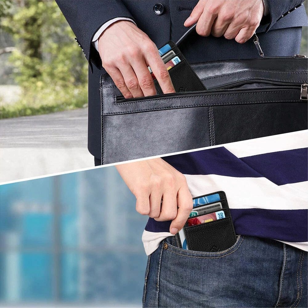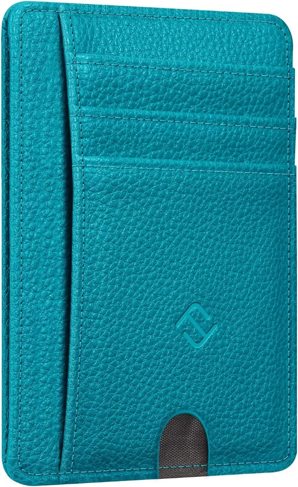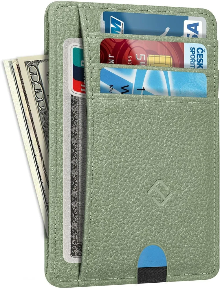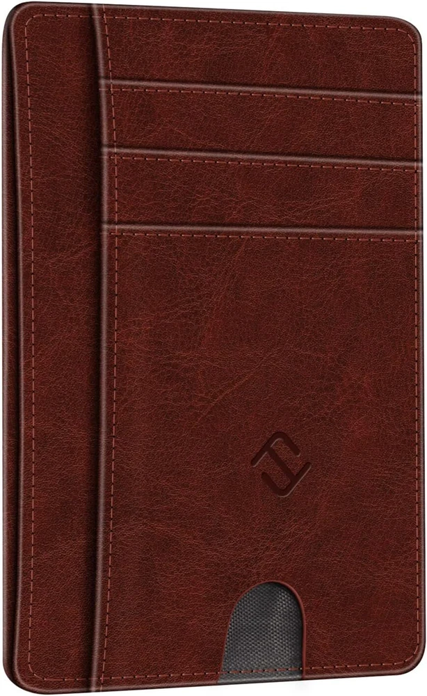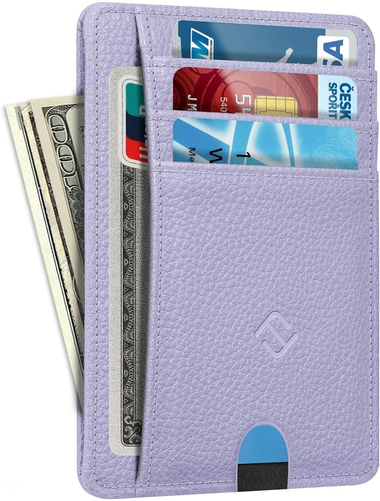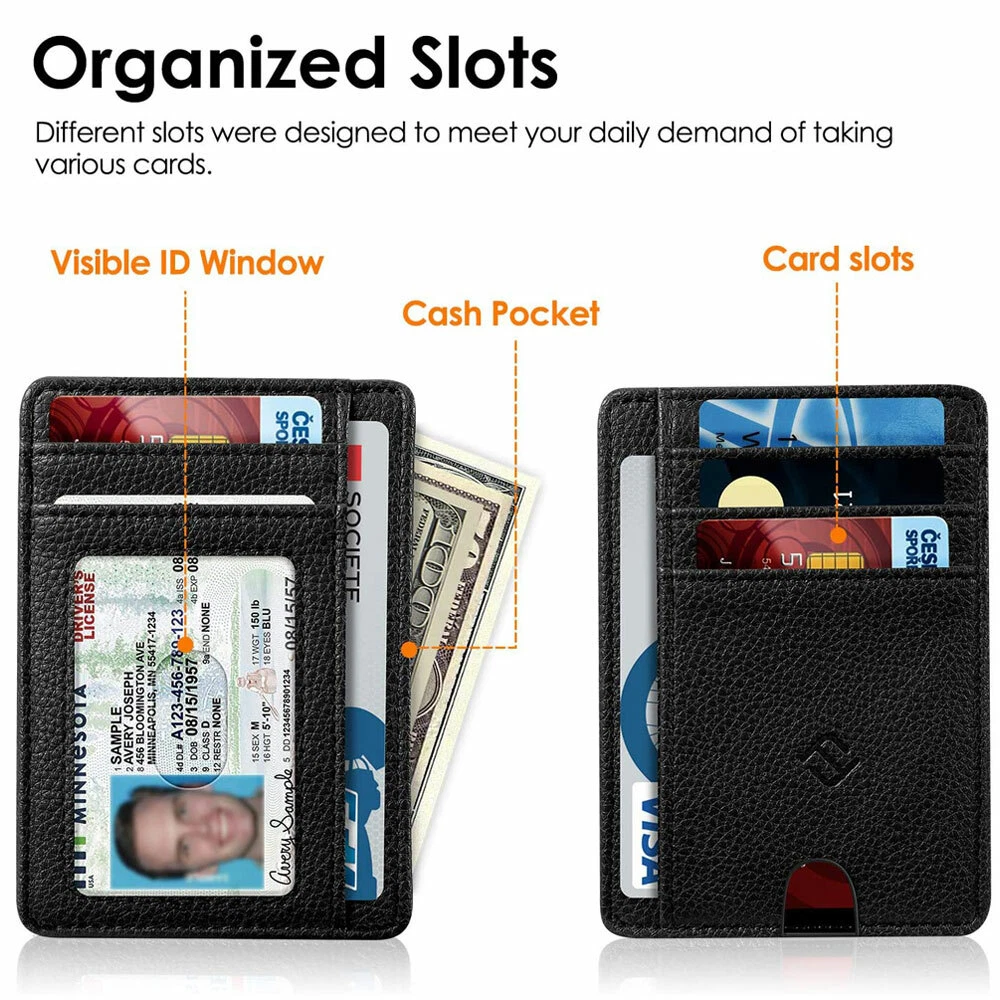 Product Description Light and Portable - Stores your carry-on essentials such as money, id cards and credit cards in a slim and lightweight front pocket wallet. Get rid of the bulky purse from now! About this item LIGHTWEIGHT & SLIM : Measuring only 4.72" x 3.35" x 0.4". It's the thin wallet that convenient to be carried around in your pocket, purse or travel pack SPACE DESIGN : It features 7 Credit card slots; 1 finger glide transparent window for ID/driving license and 1 money pocket for cash, receipt or bills EASIER TO TAKE THE CARD : Two wide card slots with thumb openings make it easier to slide the often accessed cards SECURE DESIGN : The card wallet sleeve is equipped with advanced RFID Blocking Technology; protects your valuable information stored on chips from unauthorized scans when traveling, shopping or exploring IDEAL GIFT : Built from premium composition leather - durable, sleek, functional & unisex design, is a great gift for your lover, family member or friends.