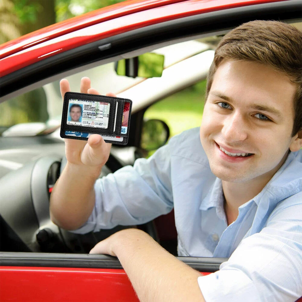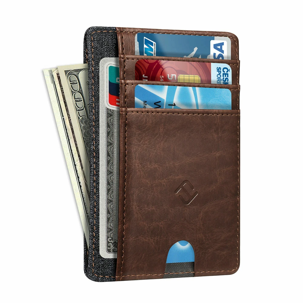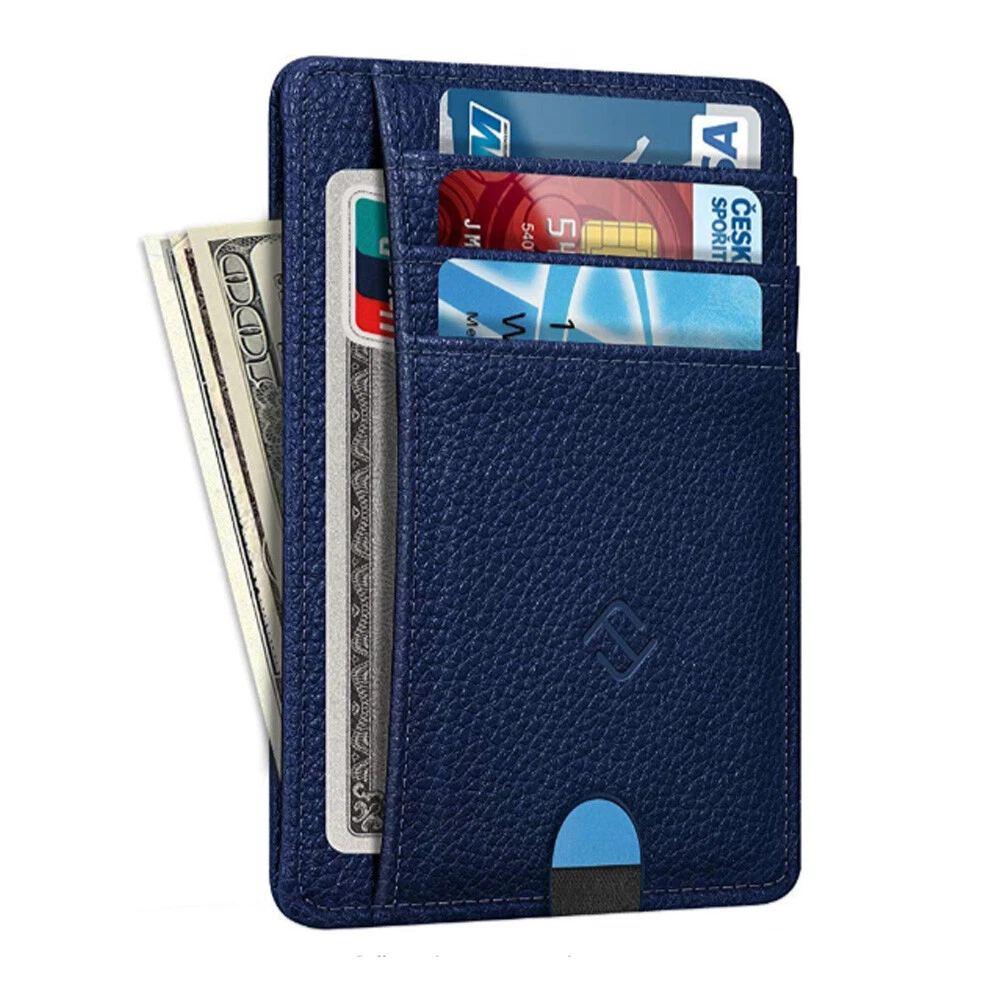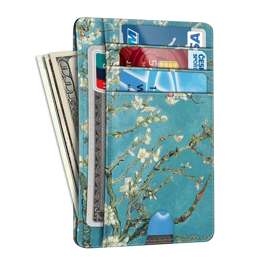 Product Description Light and Portable - Stores your carry-on essentials such as money, id cards and credit cards in a slim and lightweight front pocket wallet. Get rid of the bulky purse from now! About this item LIGHTWEIGHT & SLIM : Measuring only 4.72" x 3.35" x 0.4". It's the thin wallet that convenient to be carried around in your pocket, purse or travel pack SPACE DESIGN : It features 7 Credit card slots; 1 finger glide transparent window for ID/driving license and 1 money pocket for cash, receipt or bills EASIER TO TAKE THE CARD : Two wide card slots with thumb openings make it easier to slide the often accessed cards SECURE DESIGN : The card wallet sleeve is equipped with advanced RFID Blocking Technology; protects your valuable information stored on chips from unauthorized scans when traveling, shopping or exploring IDEAL GIFT : Built from premium composition leather - durable, sleek, functional & unisex design, is a great gift for your lover, family member or friends.