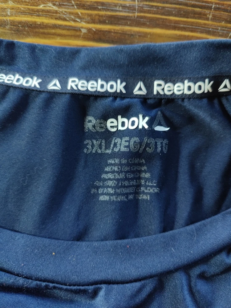 The shirt comes in a solid navy-blue color with a crew neck, 3XL and short sleeves, made from comfortable and durable polyester knit fabric. The shirt features an embroidered Reebok logo on the front, adding a touch of style and personality to any outfit. Average preowned condition showing typical signs of wear from age, use and washings. Much of the logo at the back neckline has worn off.