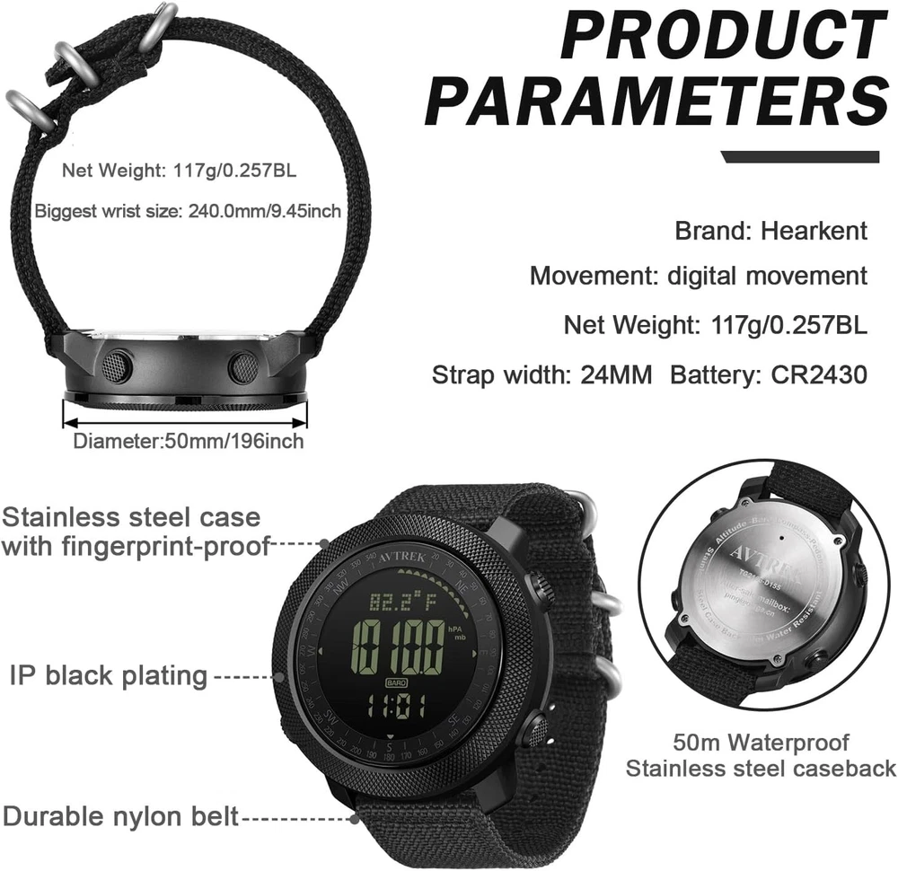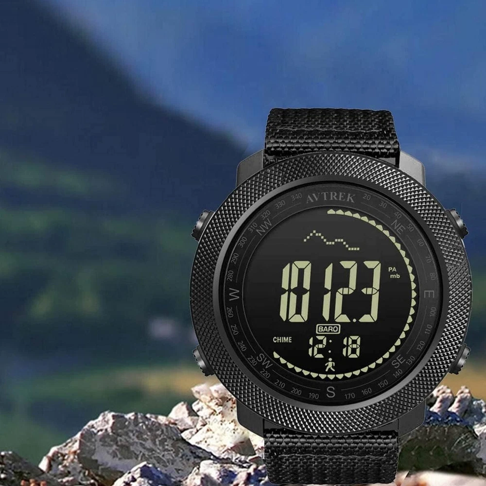 Digital Hiking Sport Watches for Men Tactical Training Military Compass Solid Watches Outdoor Multifunction Waterproof Altimeter Watches black MULTIFUNCTIONS: Altimeter. Barometer. Compass. Temperature. Pedometer. World time. 12/24H Format. Stopwatch. 50m waterproof. World time. Alarm. Countdown. EL backlight. OUTDOOR ACTIVITES: Pedometer, calorie keep track of your exercise and makes your work-out better. Compass quickly determines your direction. Barometer complemented the altimeter to provide accurate altitude information. The watch can also display the temperature. It’s a great companion for swimming, climbing, cycling, fishing etc. MATERIAL: Soft PU strap with adjustable length strap band, comfortable to wear. The dial window is made of resin mirror, high transparency, compressive and abrasion. PERFECT GIFT: The watch wrapped in a nice texture gift box and well protected. Perfect gift for boyfriend or dad. AFTER SALES: Please feel free to contact me if you have any questions about the product. we will resolve it for you as soon as possible. MULTIFUNCTIONS: Altimeter. Barometer. Compass. Temperature. Pedometer. World time. 12/24H Format. Stopwatch. 50m waterproof. World time. Alarm. Countdown. EL backlight.OUTDOOR ACTIVITES: Pedometer, calorie keep track of your exercise and makes your work-out better. Compass quickly determines your direction. Barometer complemented the altimeter to provide accurate altitude information. The watch can also display the temperature. It’s a great companion for swimming, climbing, cycling, fishing etc.MATERIAL: Soft PU strap with adjustable length strap band, comfortable to wear. The dial window is made of resin mirror, high transparency, compressive and abrasion.PERFECT GIFT: The watch wrapped in a nice texture gift box and well protected. Perfect gift for boyfriend or dad.