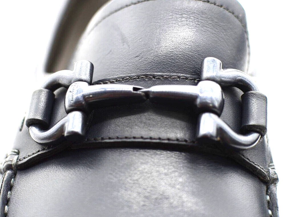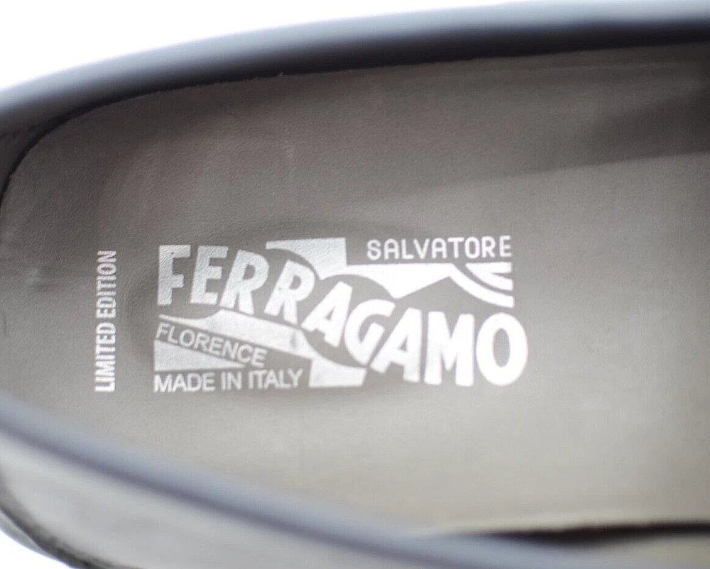 limited edition Salvatore Ferragamo 'Parigi' loafers in dark gray. Made in Italy with high-quality leather, these round toe loafers feature the iconic Gancini bit detailing and a slip-on closure for easy wear. The leather lining and insole provide ultimate comfort, making them perfect for dressy occasions. These men's size 9.5 2E loafers are a part of Ferragamo's product line and are perfect for the fashion-conscious man who appreciates premium quality footwear. Don't miss out on the opportunity to add these stylish and timeless loafers to your collection.